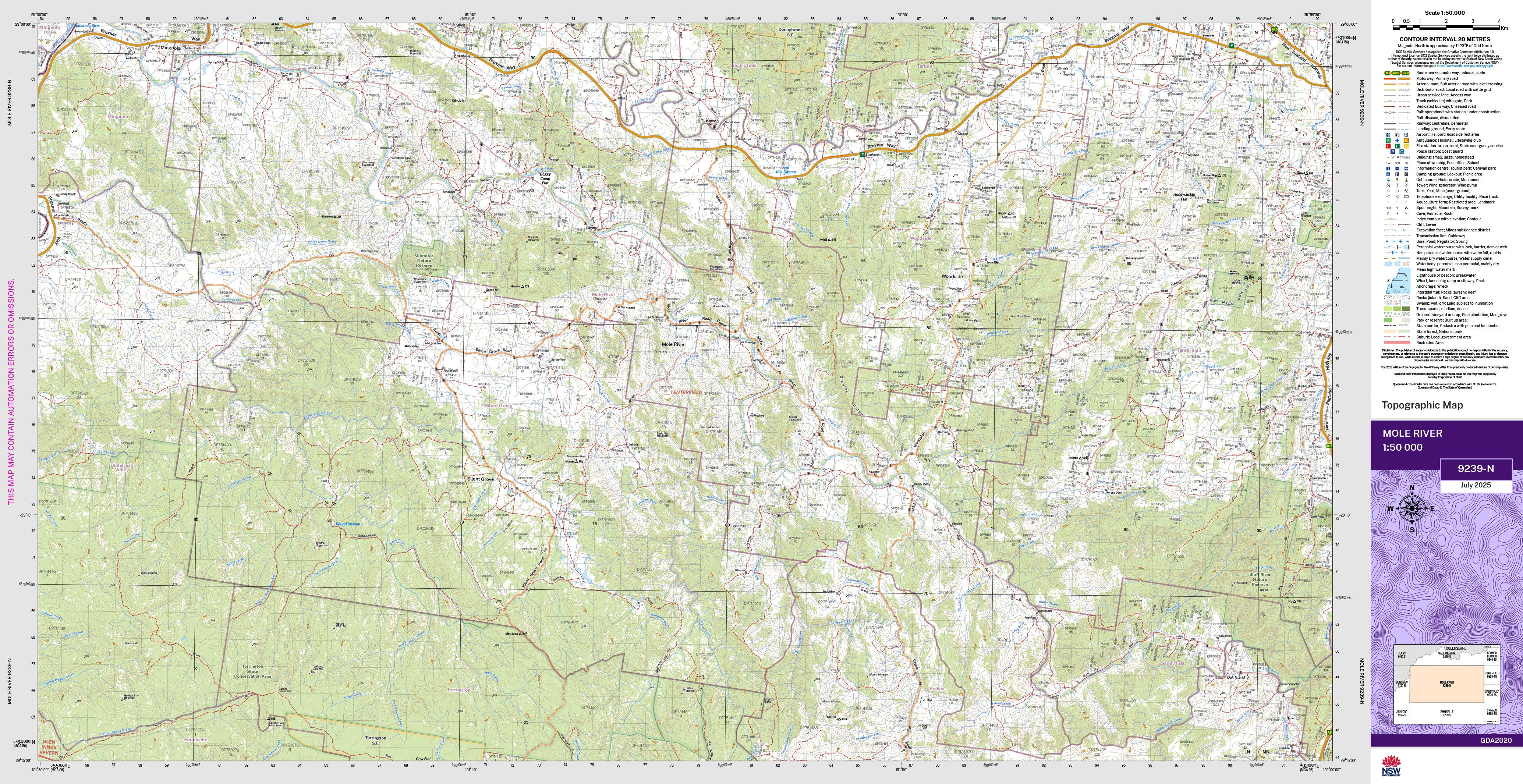 The Mole River 1:50,000 scale New South Wales topographic map shows contours, streams, roads, tracks, buildings, place names, points of interest, vegetation, selected administrative boundaries and much more.