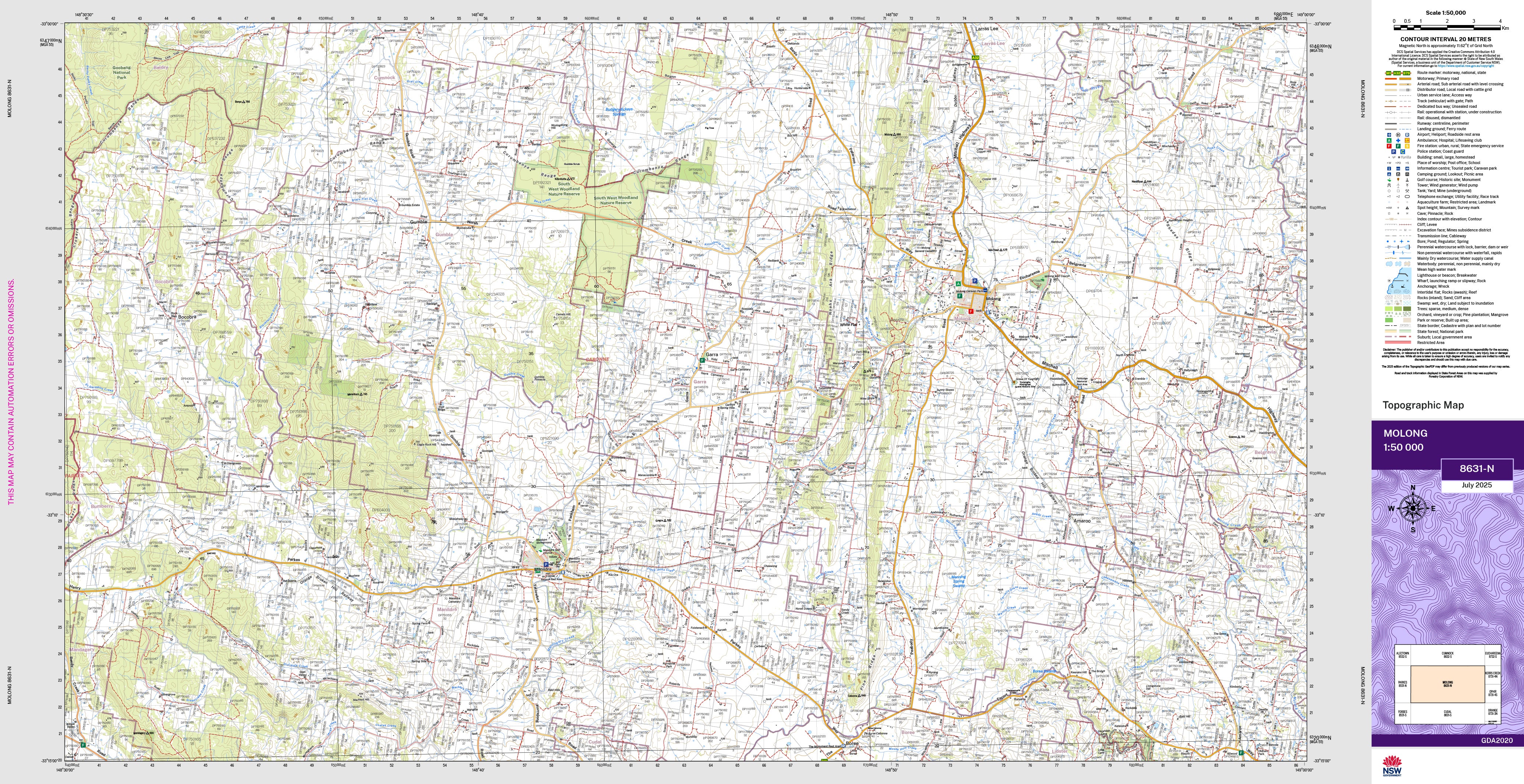 The Molong 1:50,000 scale New South Wales topographic map shows contours, streams, roads, tracks, buildings, place names, points of interest, vegetation, selected administrative boundaries and much more.