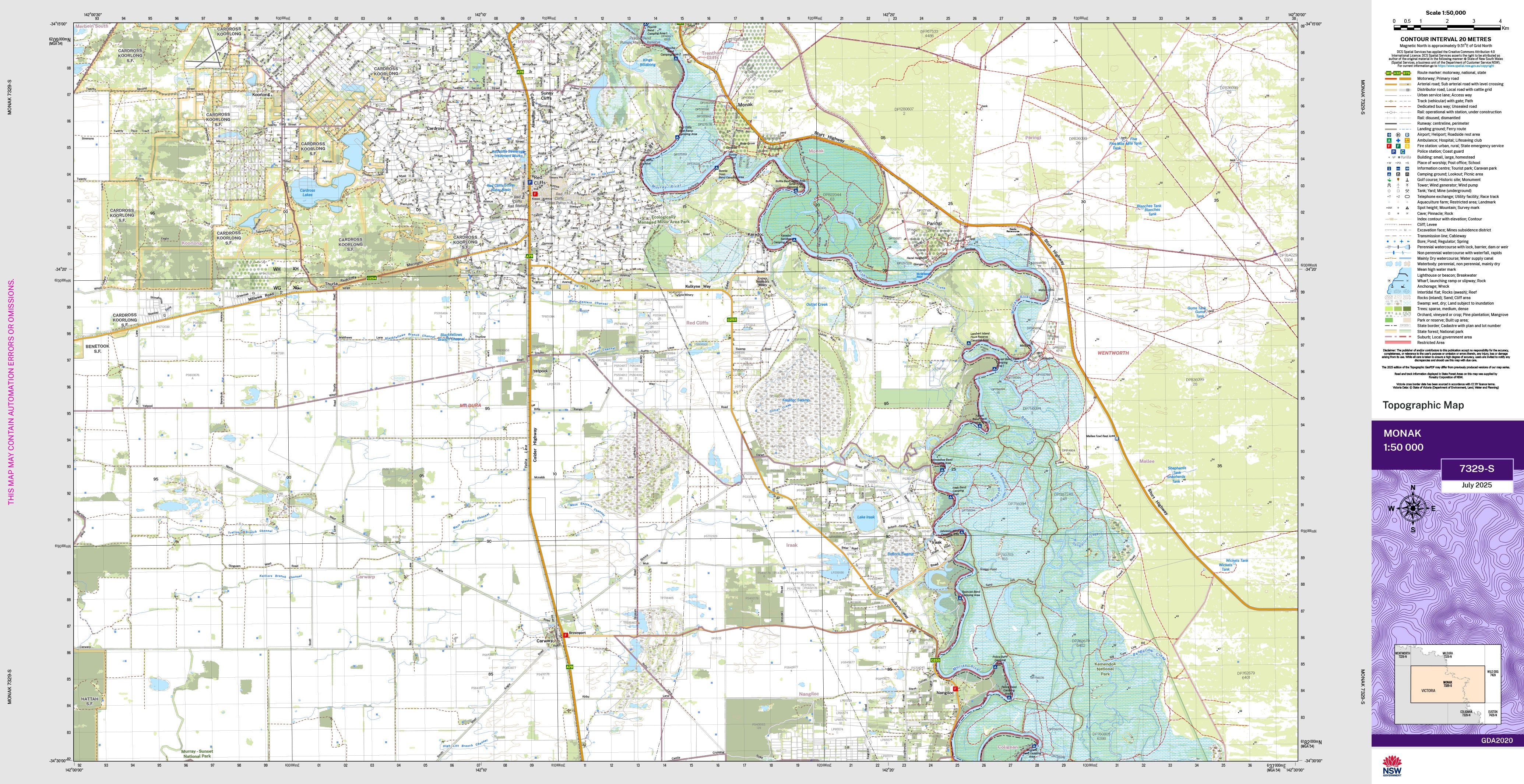 The Monak 1:50,000 scale New South Wales topographic map shows contours, streams, roads, tracks, buildings, place names, points of interest, vegetation, selected administrative boundaries and much more.