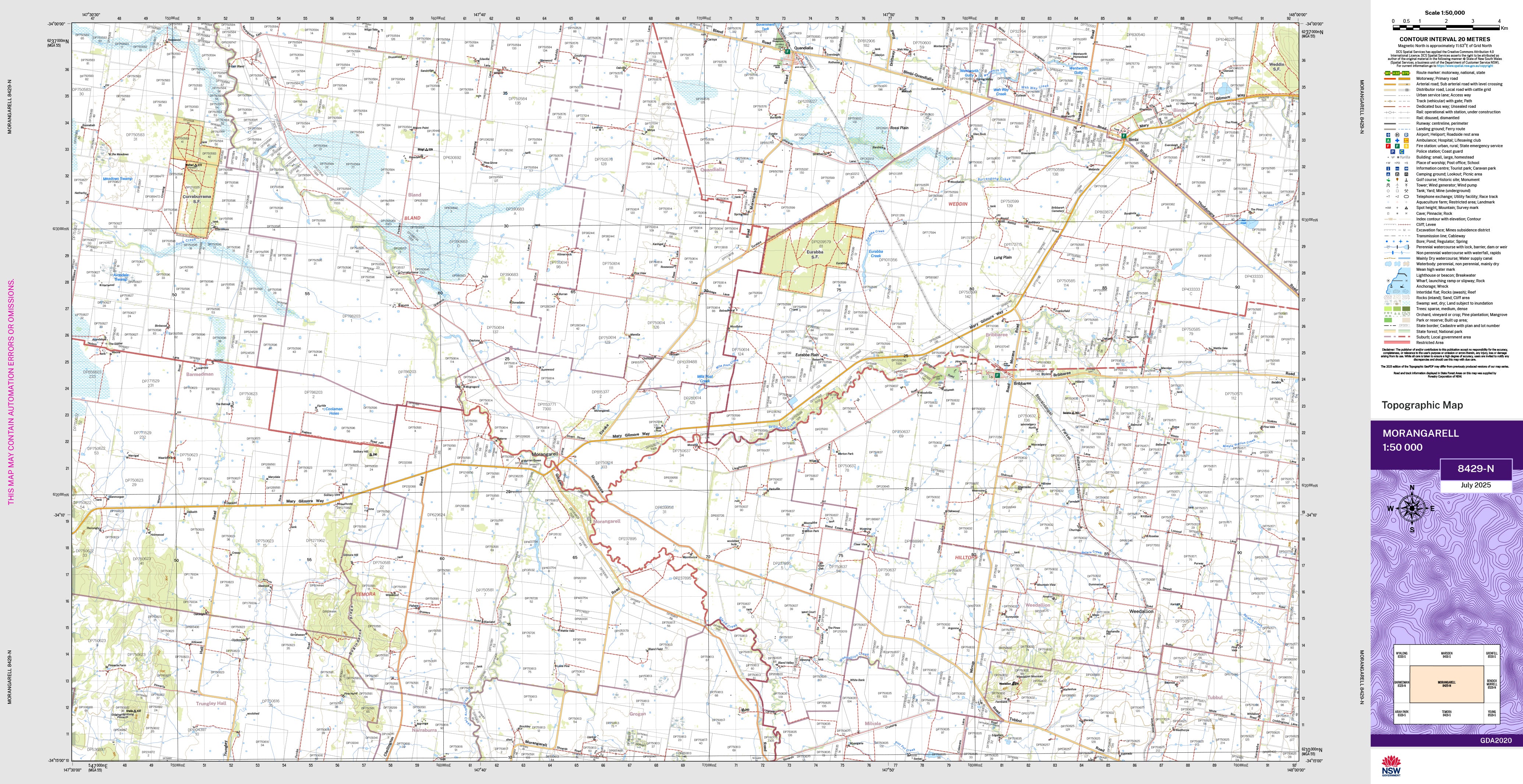 The Morangarell 1:50,000 scale New South Wales topographic map shows contours, streams, roads, tracks, buildings, place names, points of interest, vegetation, selected administrative boundaries and much more.