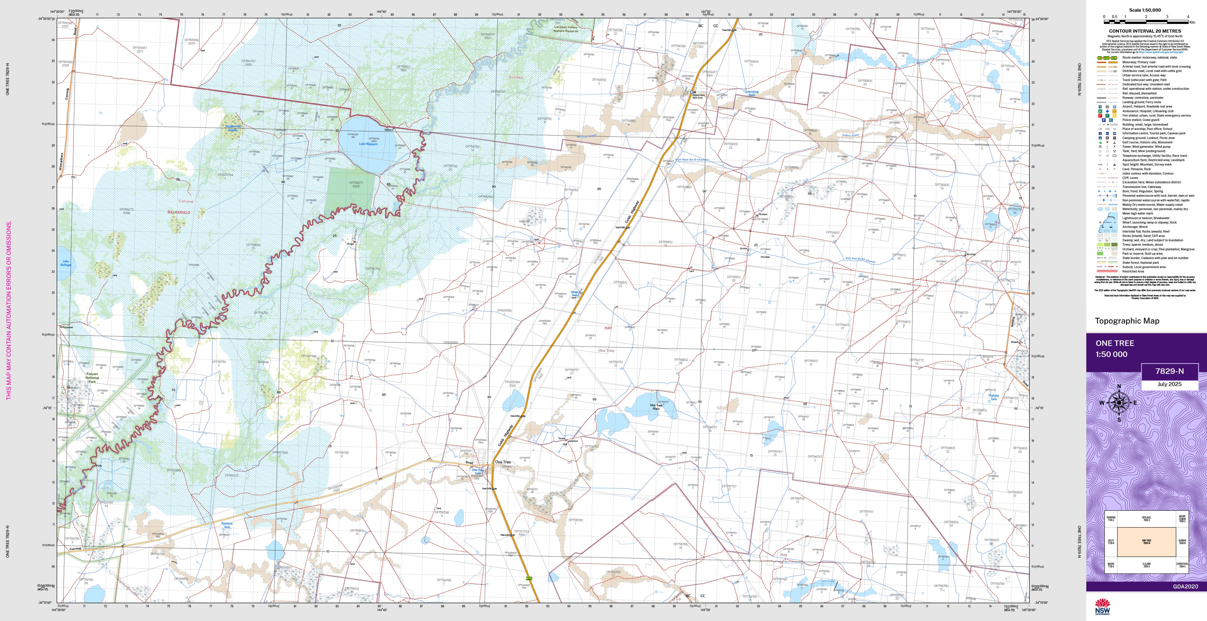 The One Tree 1:50,000 scale New South Wales topographic map shows contours, streams, roads, tracks, buildings, place names, points of interest, vegetation, selected administrative boundaries and much more.