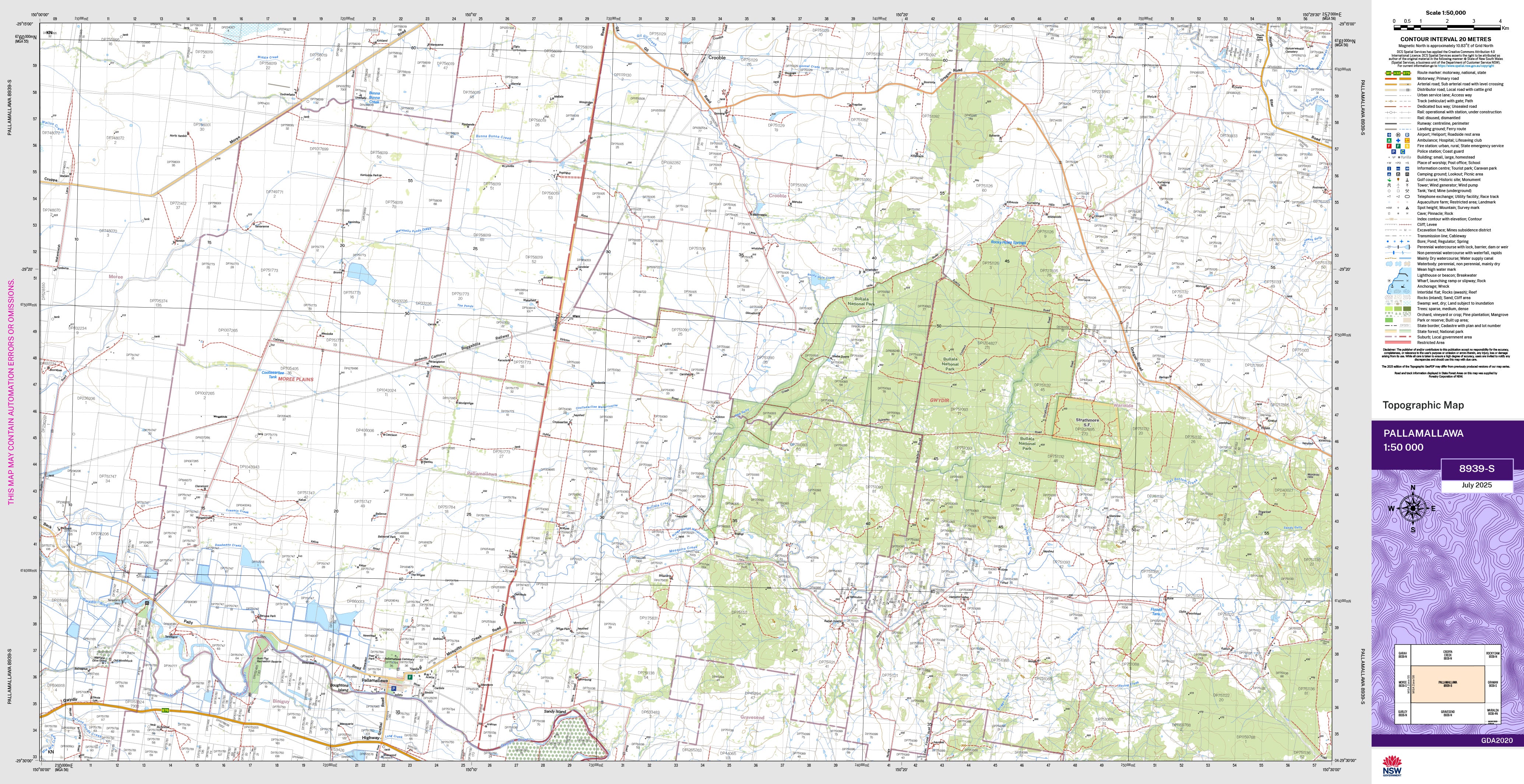 The Pallamallawa 1:50,000 scale New South Wales topographic map shows contours, streams, roads, tracks, buildings, place names, points of interest, vegetation, selected administrative boundaries and much more.