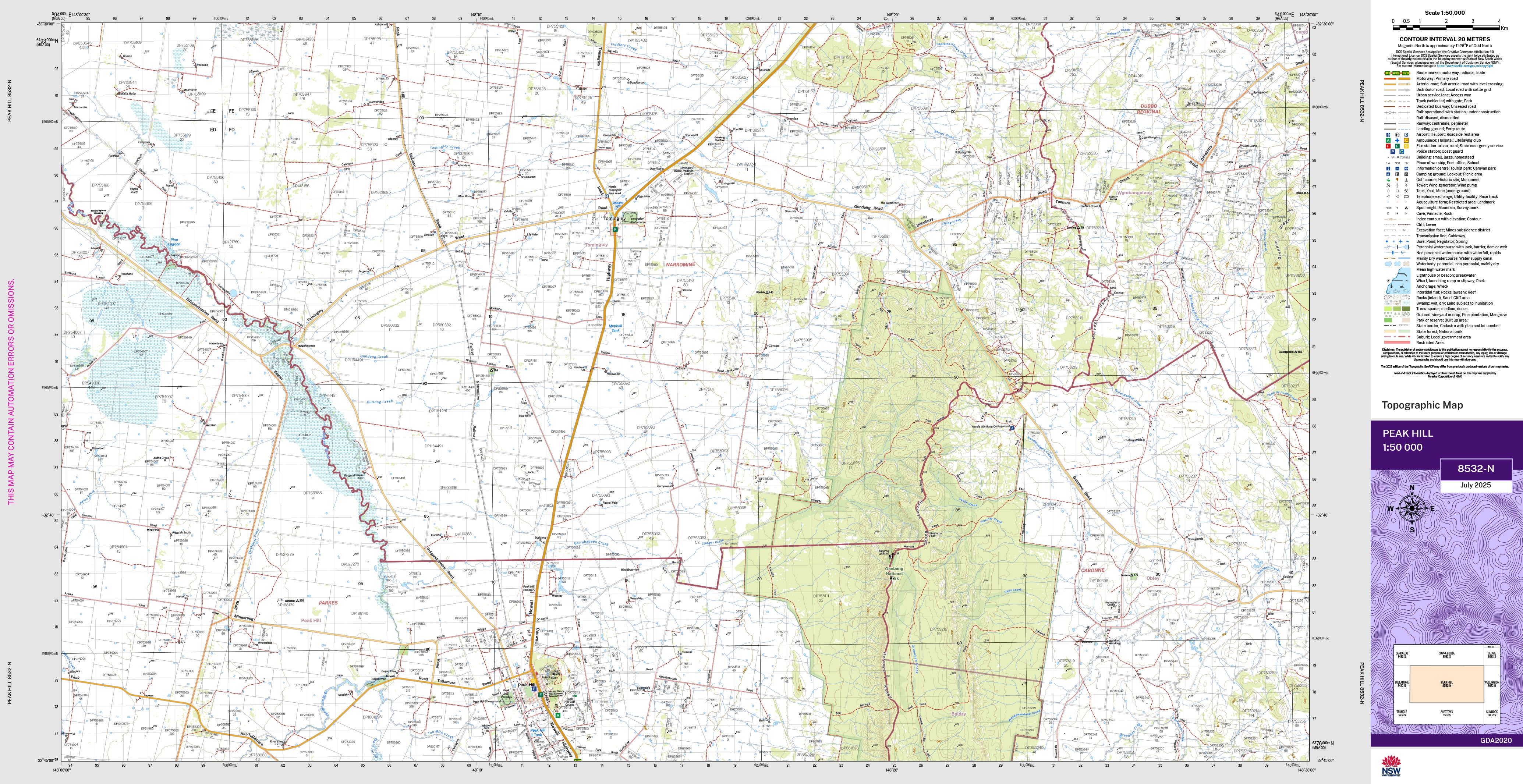 The Peak Hill 1:50,000 scale New South Wales topographic map shows contours, streams, roads, tracks, buildings, place names, points of interest, vegetation, selected administrative boundaries and much more.