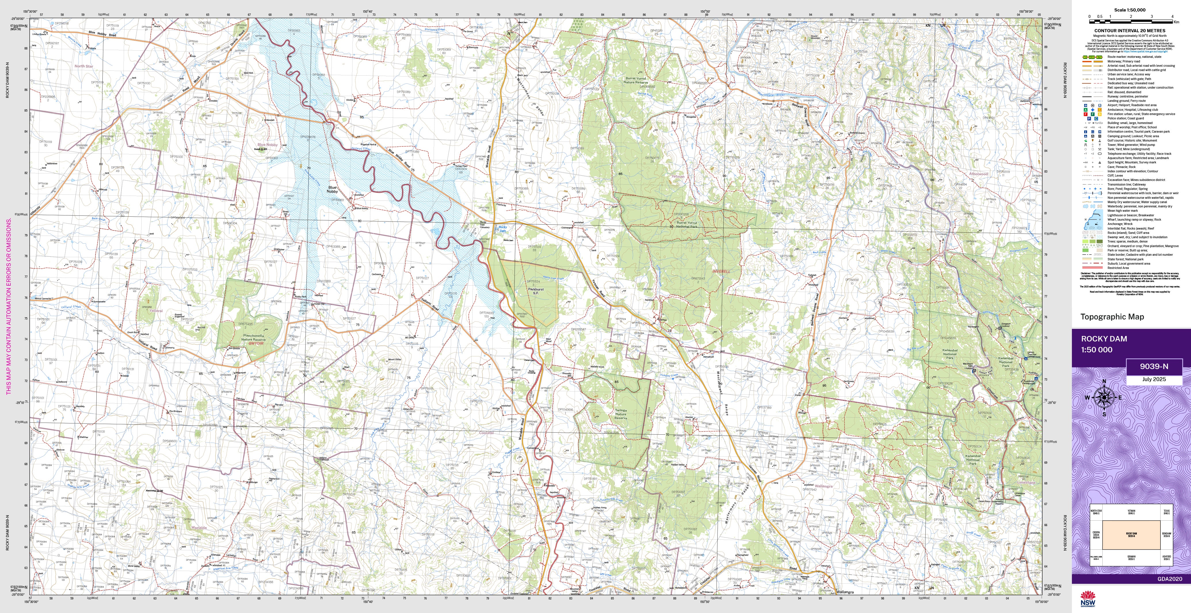 The Rocky Dam 1:50,000 scale New South Wales topographic map shows contours, streams, roads, tracks, buildings, place names, points of interest, vegetation, selected administrative boundaries and much more.