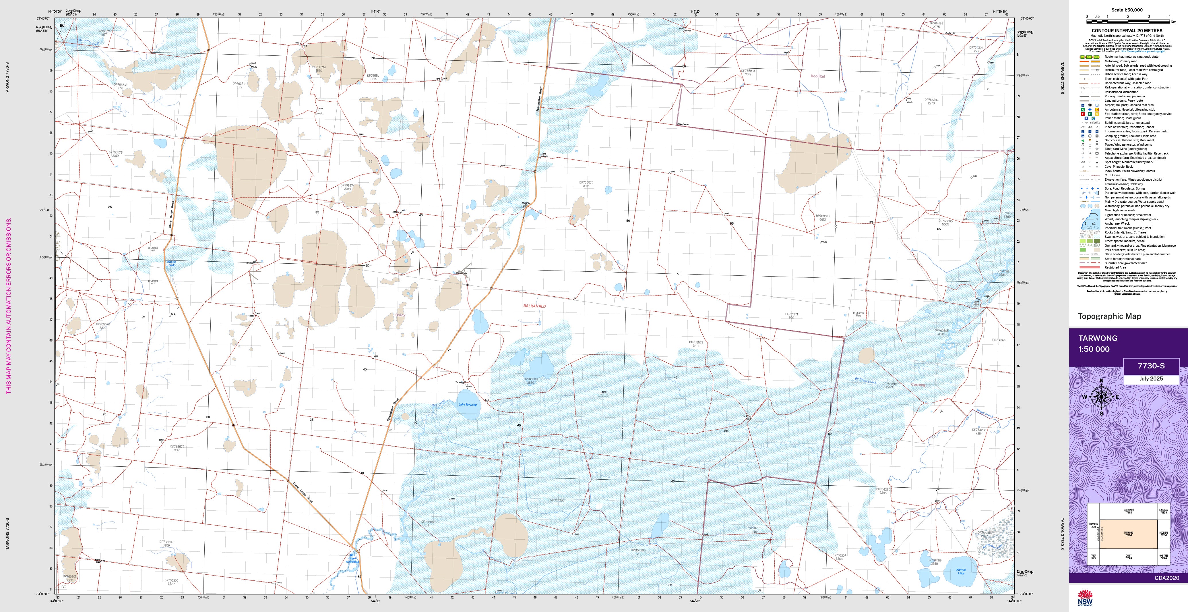 The Tarwong 1:50,000 scale New South Wales topographic map shows contours, streams, roads, tracks, buildings, place names, points of interest, vegetation, selected administrative boundaries and much more.