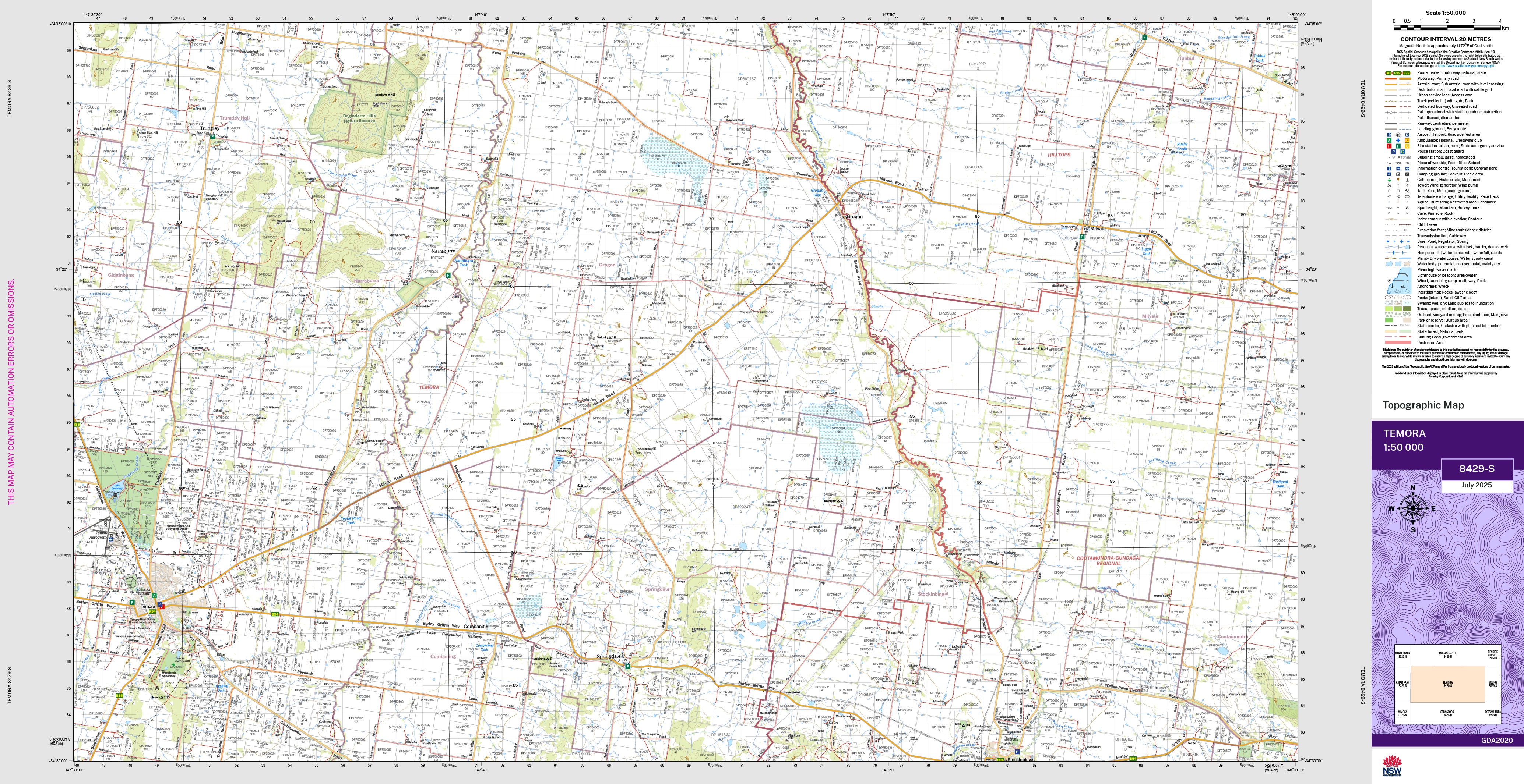 The Temora 1:50,000 scale New South Wales topographic map shows contours, streams, roads, tracks, buildings, place names, points of interest, vegetation, selected administrative boundaries and much more.