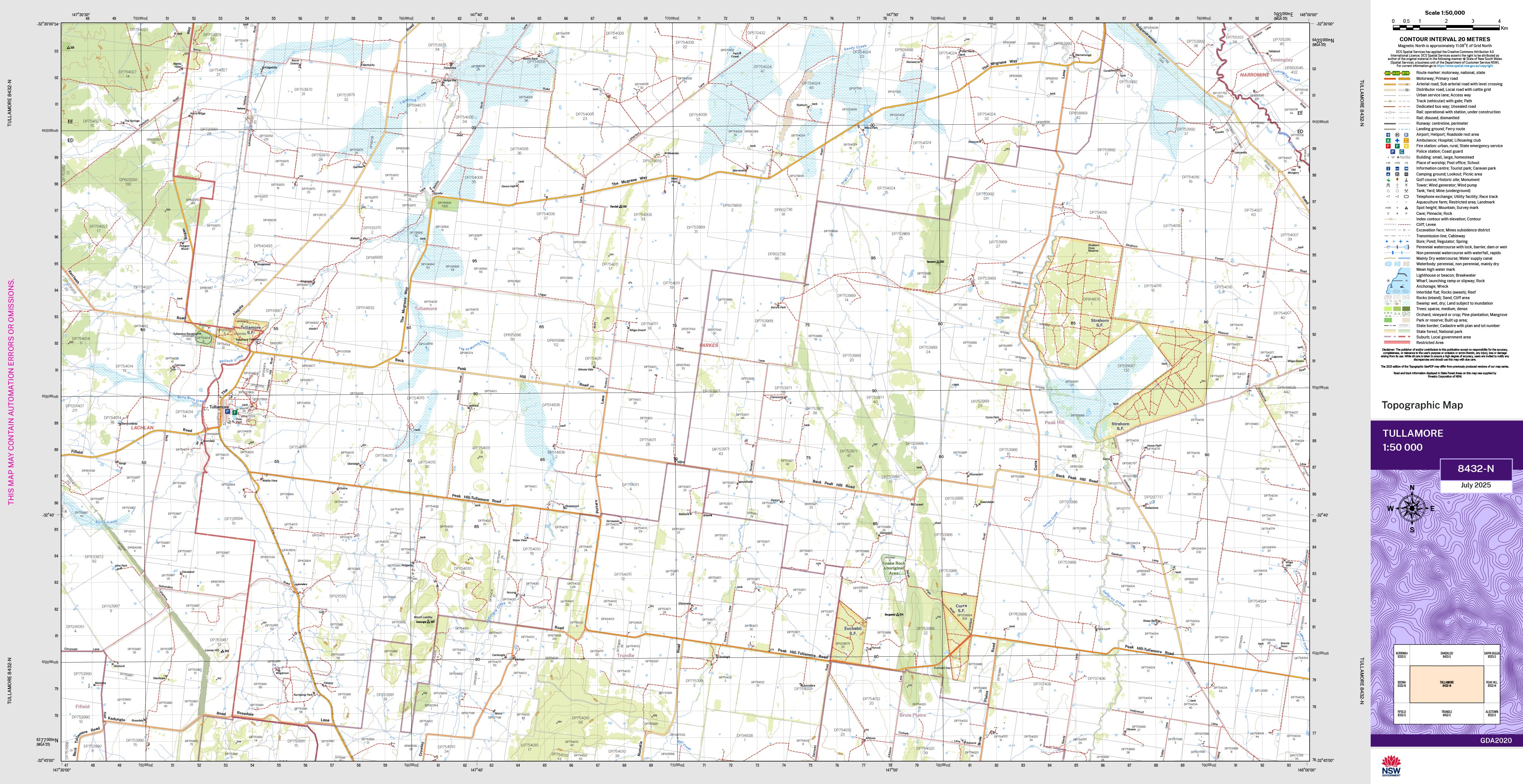 The Tullamore 1:50,000 scale New South Wales topographic map shows contours, streams, roads, tracks, buildings, place names, points of interest, vegetation, selected administrative boundaries and much more.