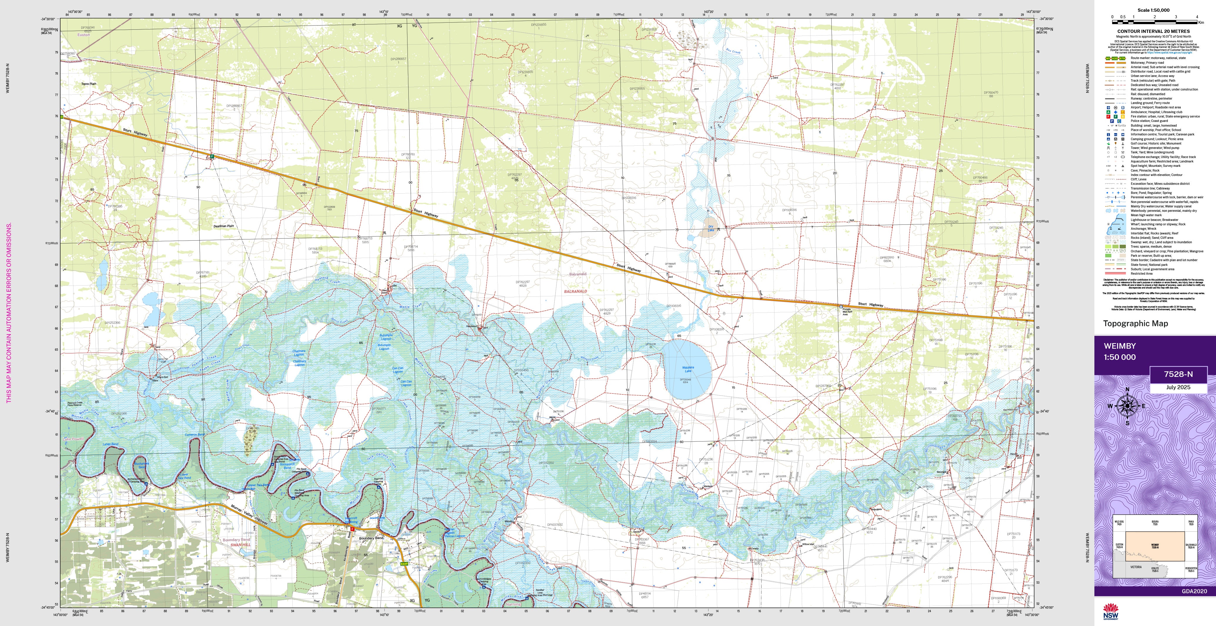The Weimby 1:50,000 scale New South Wales topographic map shows contours, streams, roads, tracks, buildings, place names, points of interest, vegetation, selected administrative boundaries and much more.
