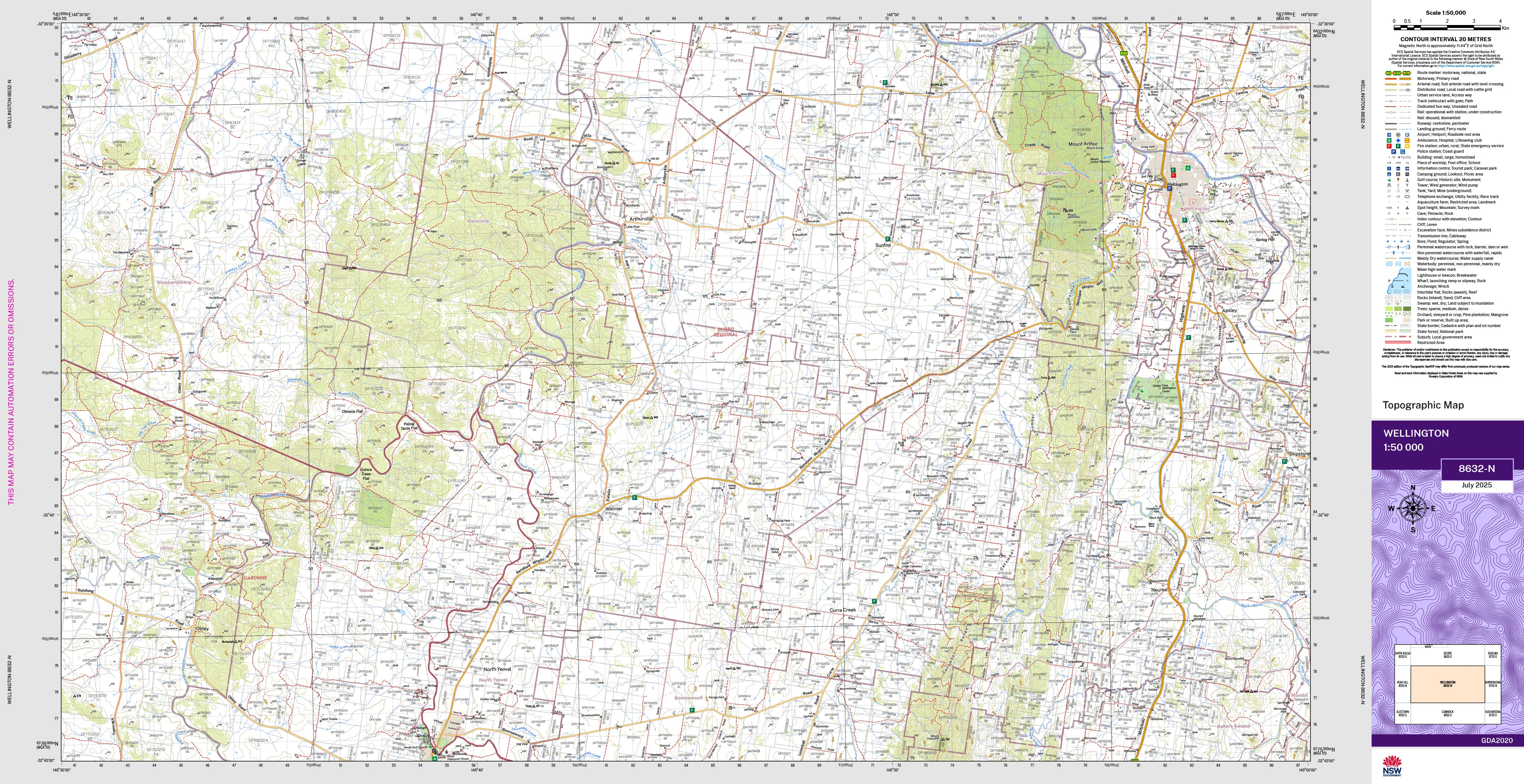 The Wellington 1:50,000 scale New South Wales topographic map shows contours, streams, roads, tracks, buildings, place names, points of interest, vegetation, selected administrative boundaries and much more.