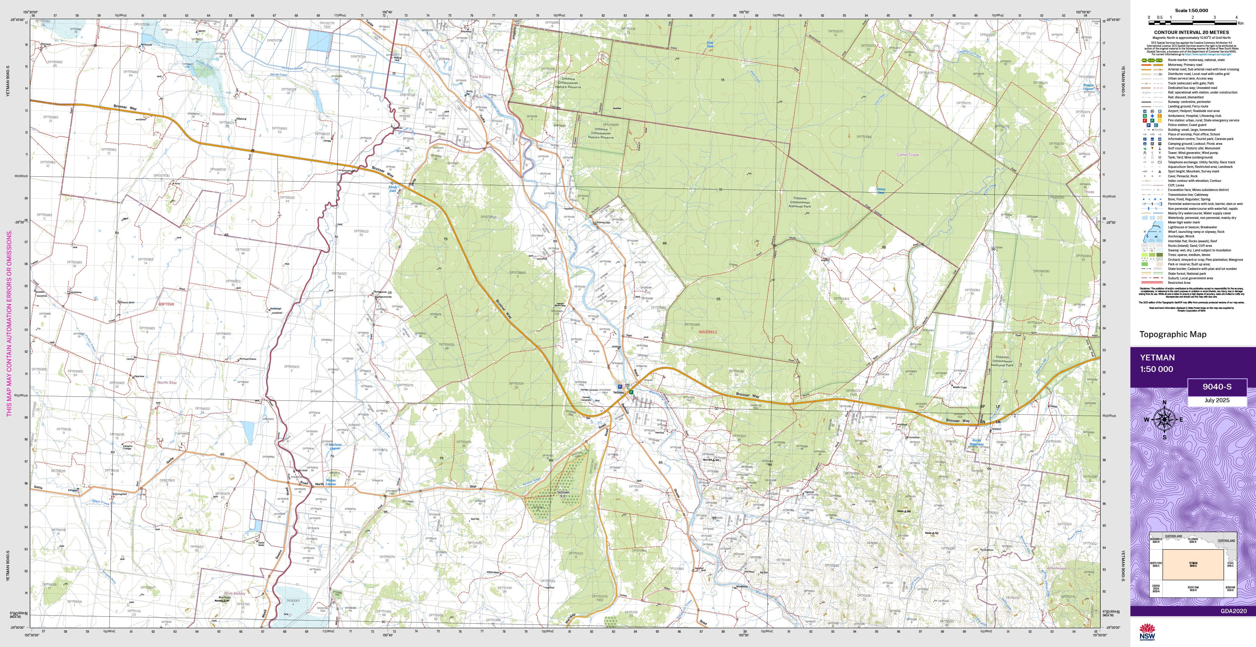 The Yetman 1:50,000 scale New South Wales topographic map shows contours, streams, roads, tracks, buildings, place names, points of interest, vegetation, selected administrative boundaries and much more.