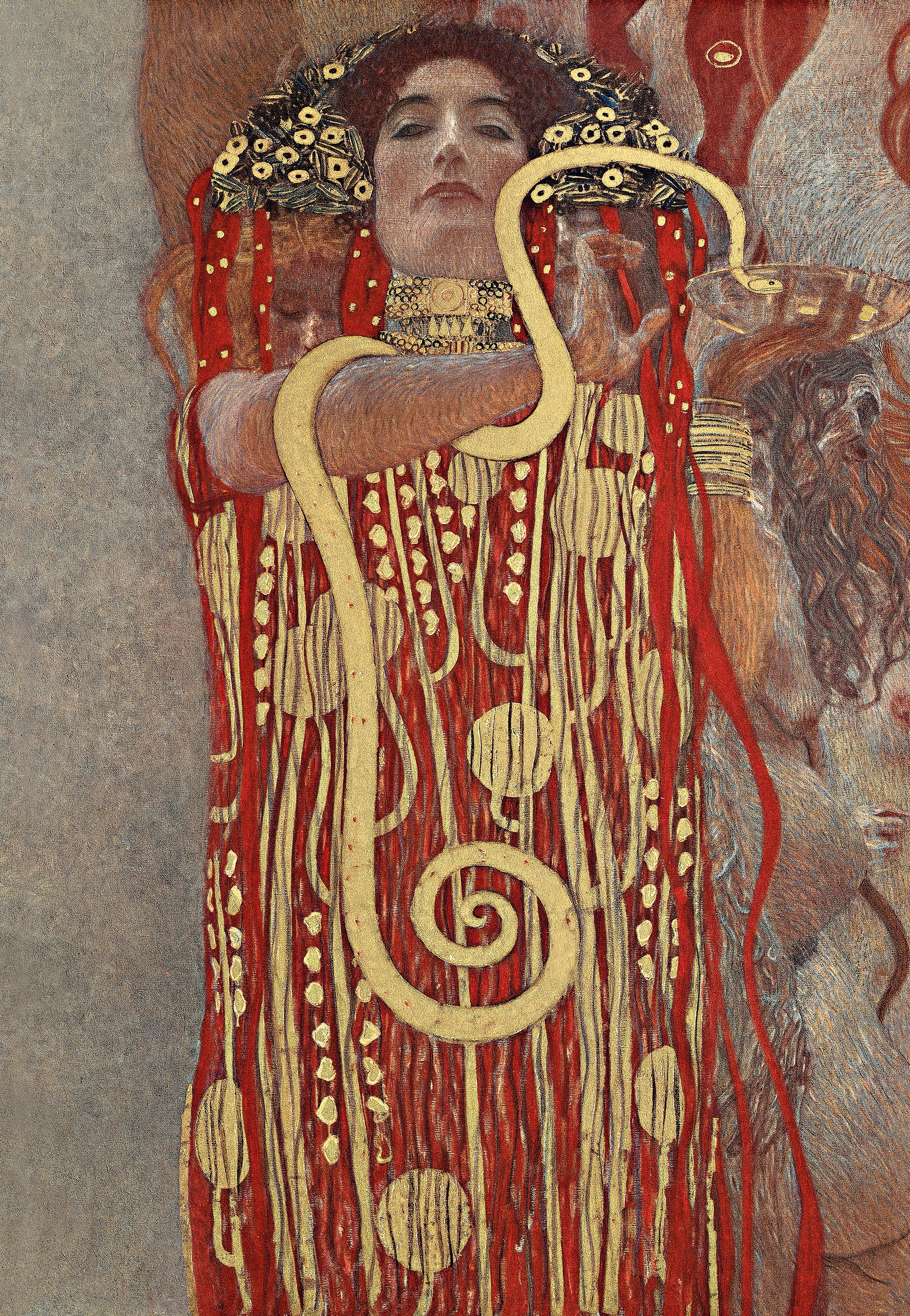 A guardian of health in red and gold: frontal, impassive, and haloed by ornament. This fine-art reproduction—after Klimt’s iconic figure of Hygieia—glows with the luxe geometry of his Golden Period: mosaic-like pattern, serpentine line, and symbolic attributes that turn a classical goddess into a modern icon.