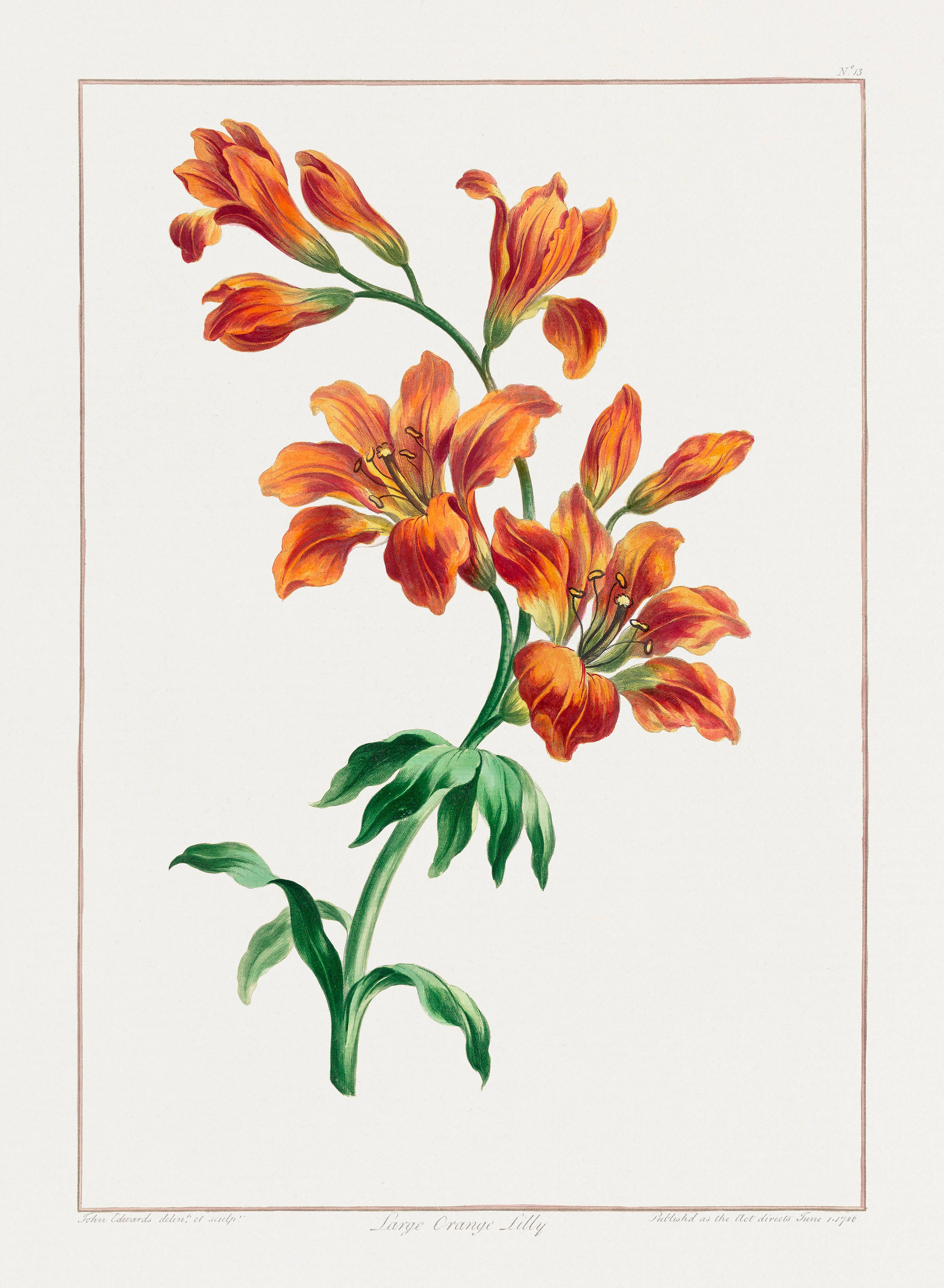 Petals like small suns, freckles of deep umber, leaves rising in elegant tiers—this Georgian-era botanical captures the lily at full, luminous bloom. Edwards balances scientific clarity with decorative poise: every vein, filament, and curling petal rendered with late-18th-century finesse. A radiant print that brings garden brilliance into calm, refined interiors.