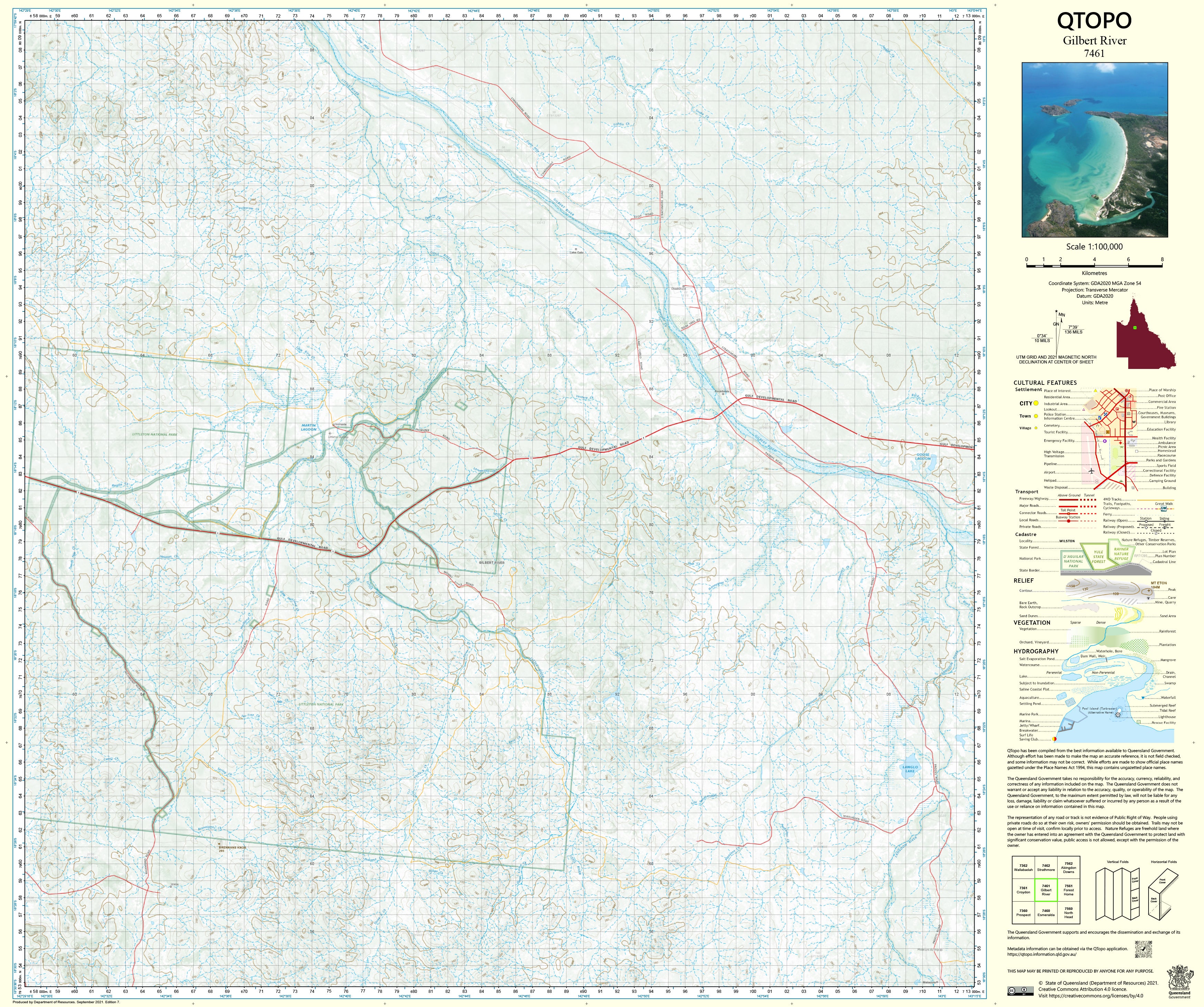 Produced by the Queensland Department of Resources, the QTopo 7461 (Gilbert River) map presents clear elevation patterns, hydrology networks, vegetation distribution, infrastructure, and land-tenure boundaries across a vast inland area shaped by seasonal rainfall and long dry periods. Its broad-scale resolution is ideal for interpreting catchment dynamics, regional landforms, and property-level context over large distances.