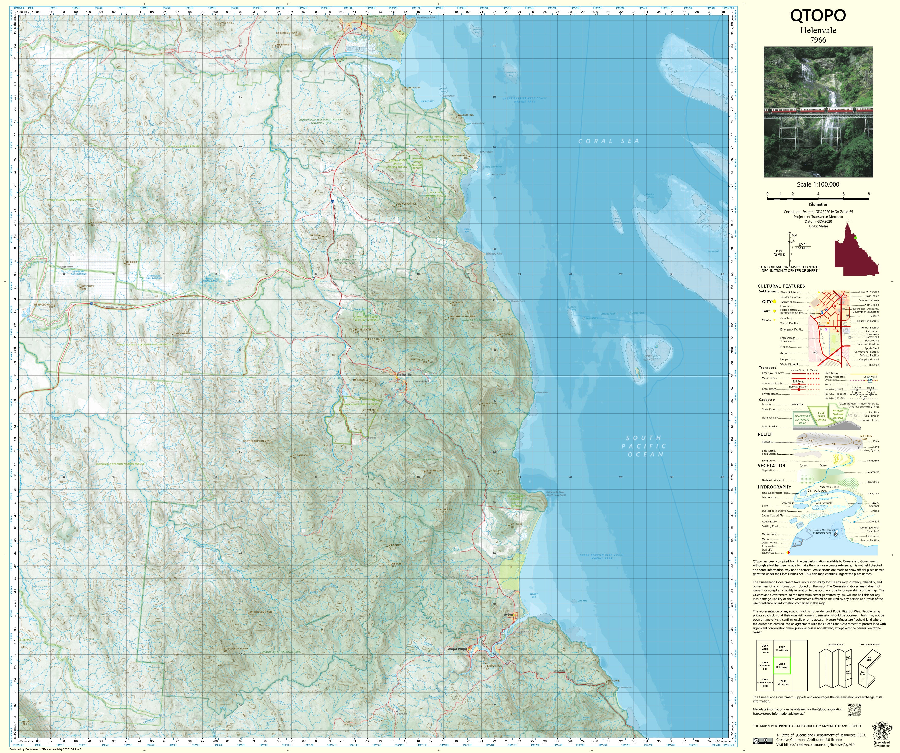 The QTopo 7966 (Helenvale) sheet provides essential regional clarity for environmental studies, land management, emergency response, tourism operations, and remote-area navigation. Produced by the Queensland Department of Resources, it offers accurate terrain modelling, hydrology detail, vegetation distribution, infrastructure networks, and land-tenure boundaries across a region shaped by tropical rainfall, steep topography, and long unsealed routes.