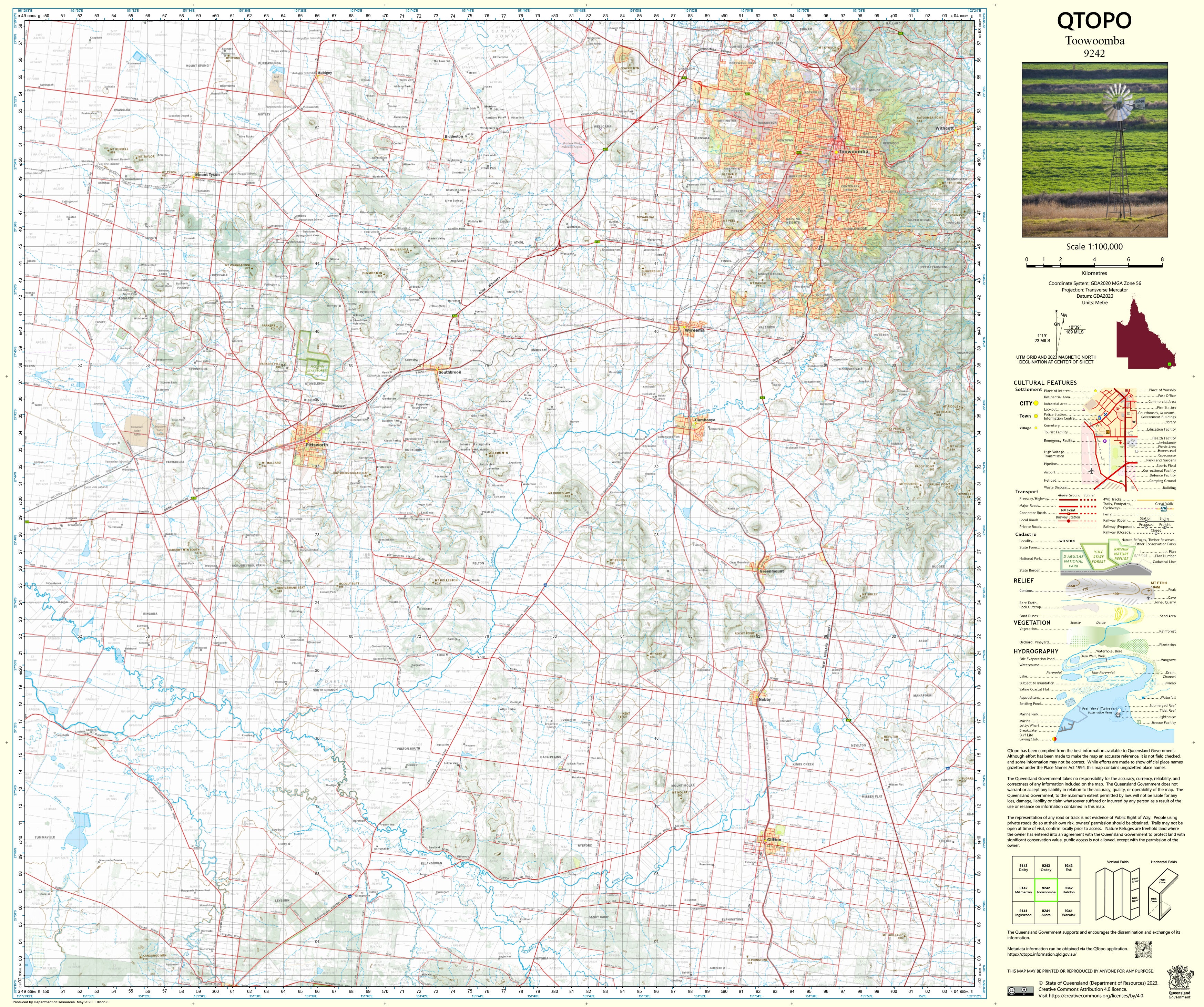 The QTopo 9242 (Toowoomba) sheet provides reliable, expertly sourced geographic detail for land-use planning, infrastructure development, environmental assessment, emergency operations, agriculture, and outdoor exploration. Produced by the Queensland Department of Resources, it offers clear terrain modelling, hydrological information, access networks, vegetation patterns, and land-tenure boundaries across both urban and rural landscapes.