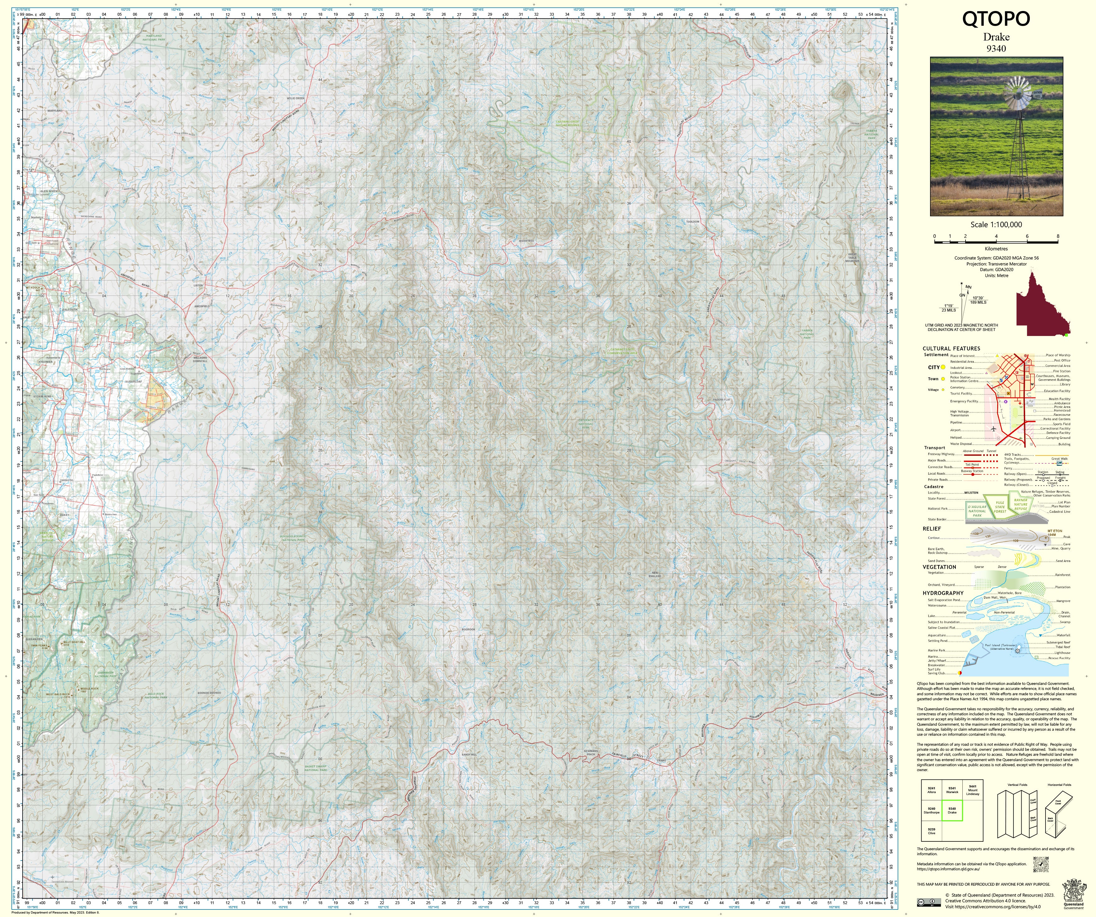 The QTopo 9340 (Drake) sheet delivers accurate regional-scale mapping essential for environmental assessment, emergency response, land management, geological exploration, and bush navigation. Produced by the Queensland Department of Resources, it features precise terrain modelling, hydrological networks, vegetation patterns, access routes, and land-tenure boundaries across challenging and varied terrain.