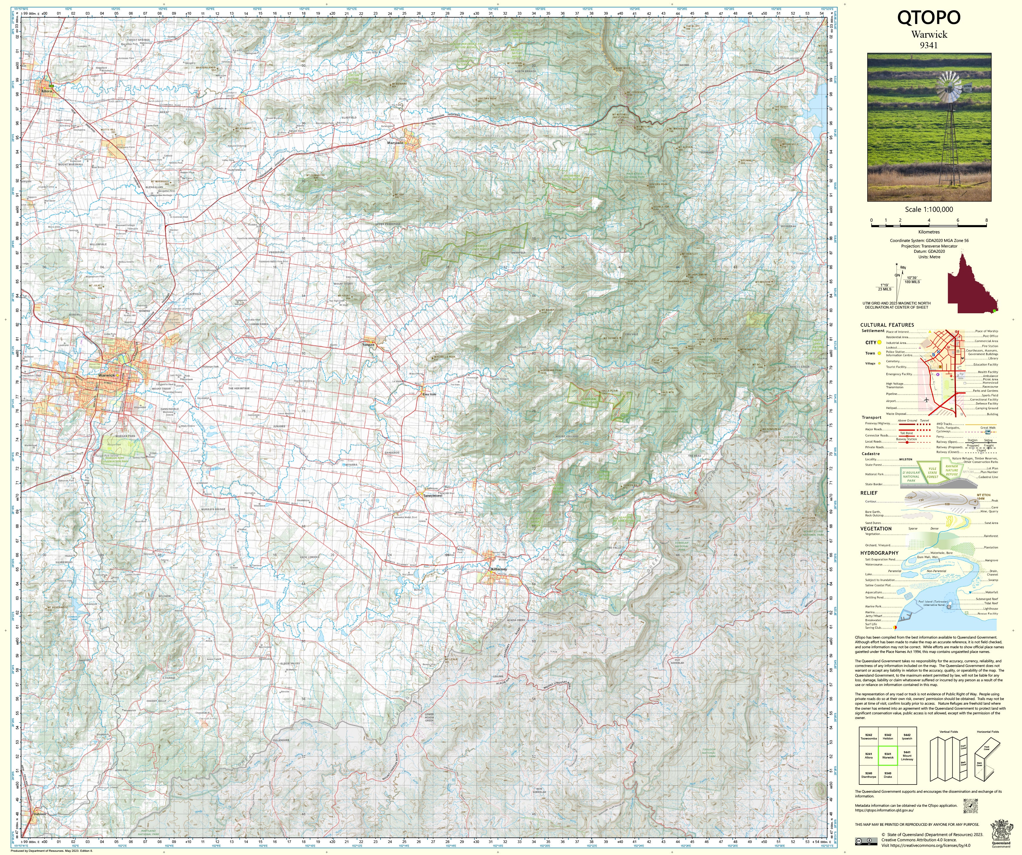 The QTopo 9341 (Warwick) sheet provides clear, accurate mapping for agricultural uses, environmental studies, infrastructure planning, emergency services, surveying, and outdoor exploration. Produced by the Queensland Department of Resources, it features precise contouring, hydrology networks, vegetation patterns, transport corridors, and land-tenure boundaries across both settled and remote terrain.