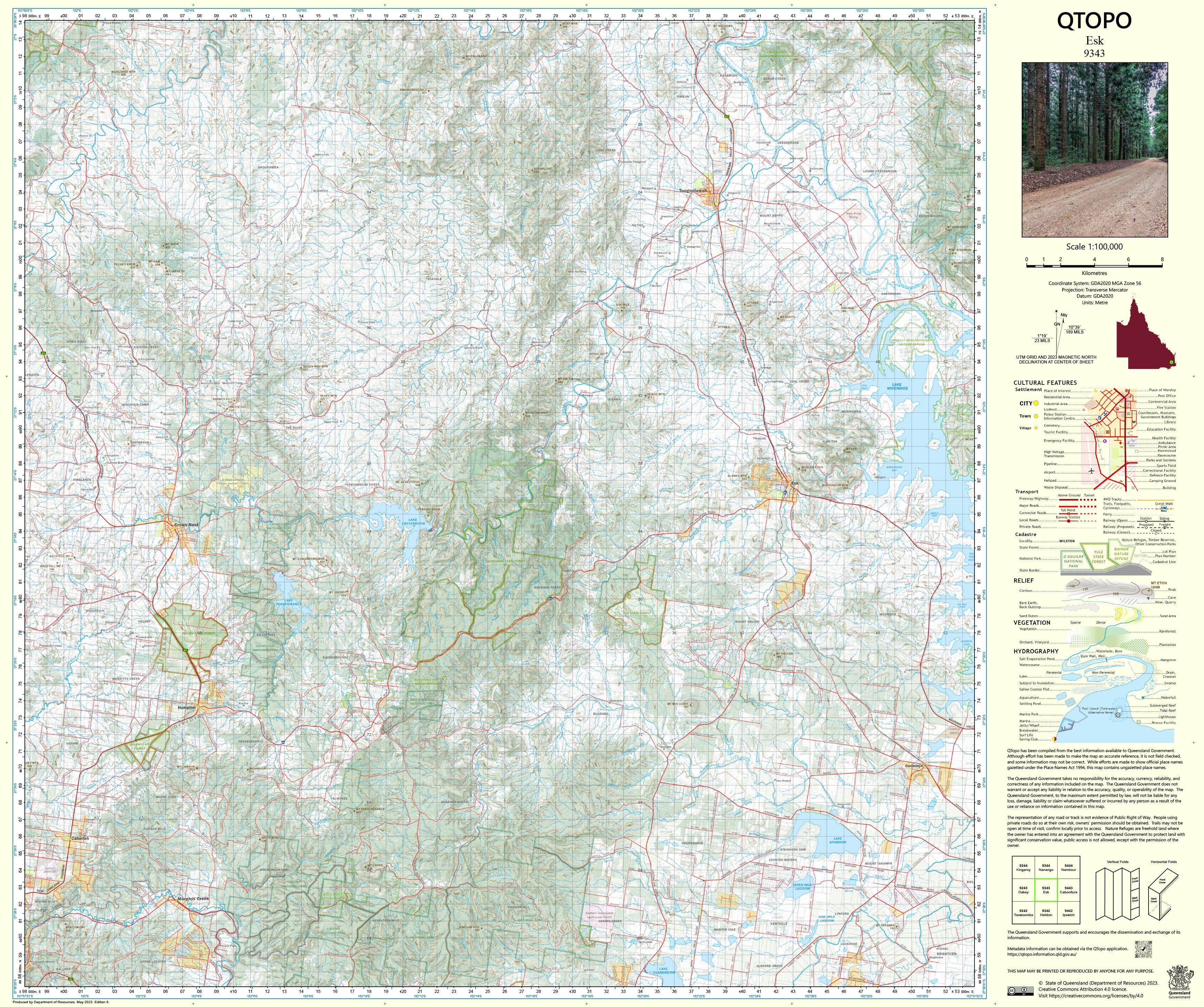 The QTopo 9343 (Esk) sheet provides precise, wide-area mapping essential for land management, environmental studies, emergency operations, surveying, infrastructure planning, and outdoor recreation. Produced by the Queensland Department of Resources, it delivers accurate terrain modelling, hydrological networks, vegetation structure, and land-tenure boundaries across a region defined by contrasting lowlands and forested highlands.