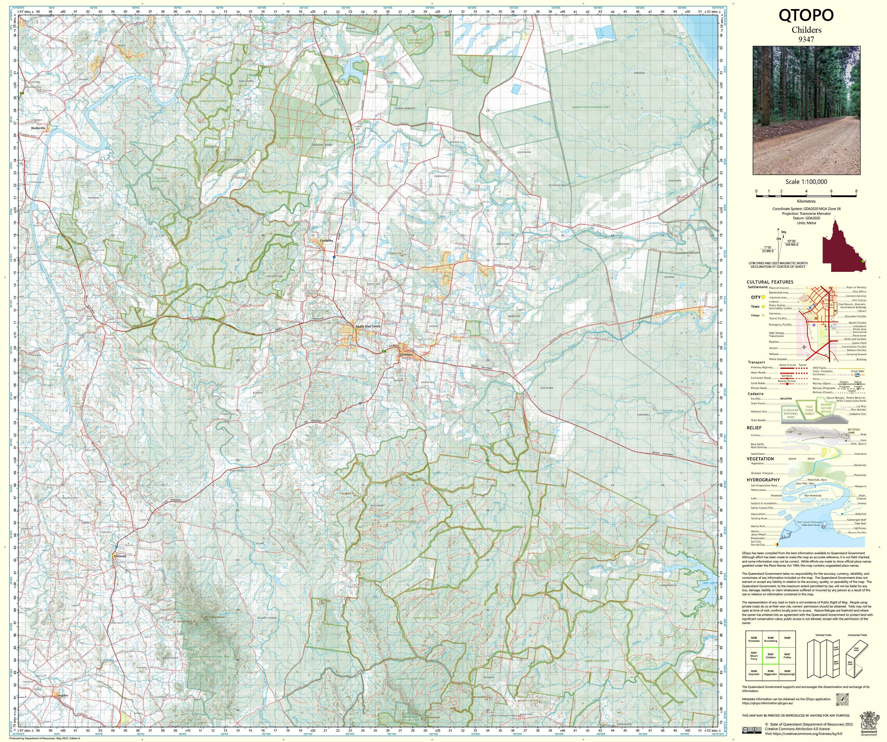 The QTopo 9347 (Childers) sheet provides clear, comprehensive regional mapping ideal for land-use planning, agricultural operations, environmental studies, emergency management, surveying, and outdoor exploration. Produced by the Queensland Department of Resources, it offers precise terrain modelling, detailed hydrology, vegetation mapping, infrastructure networks, and land-tenure boundaries across a landscape defined by both natural features and intensive farming.