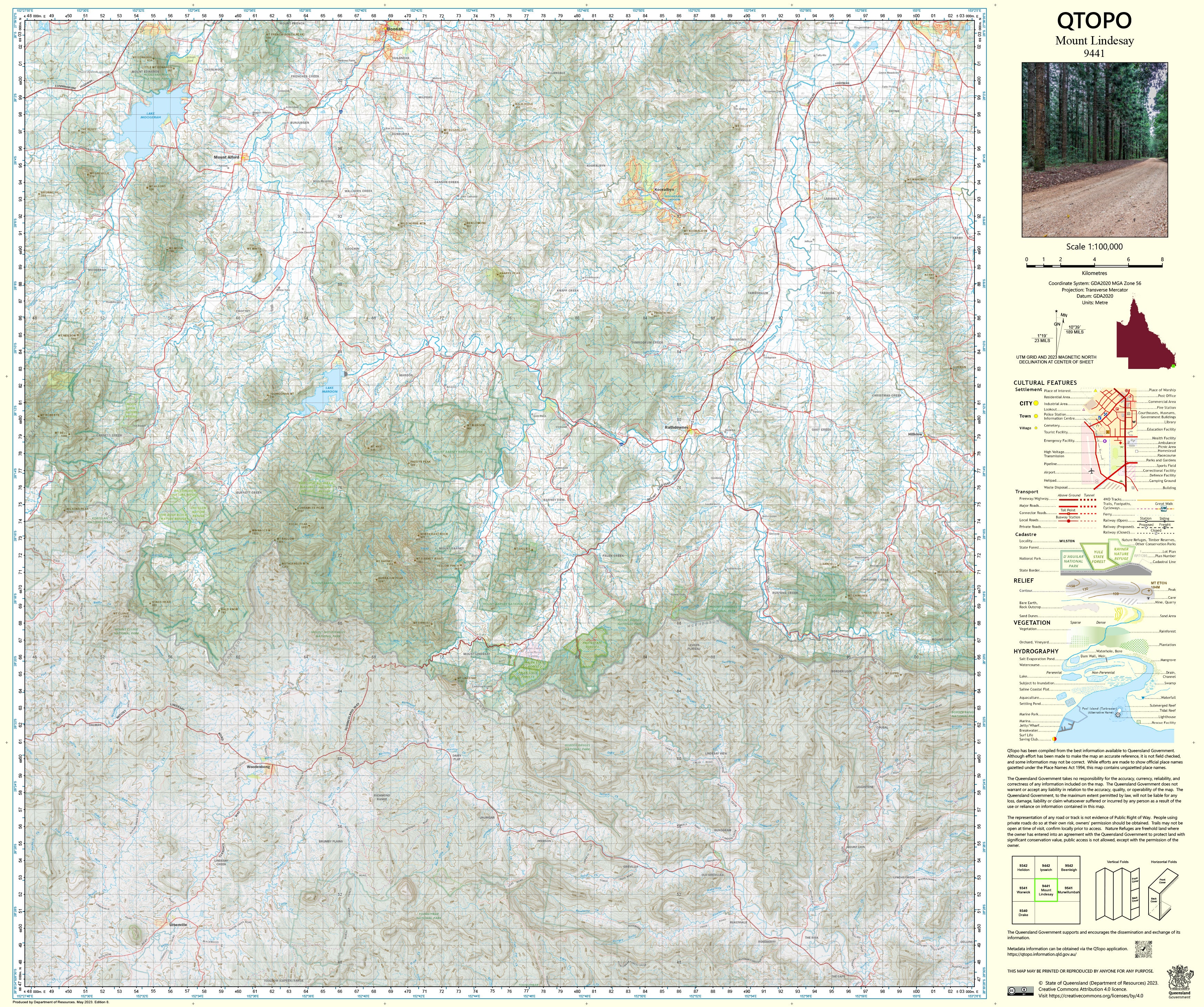 The QTopo 9441 (Mount Lindesay) sheet provides high-quality regional mapping essential for environmental management, emergency response, land surveying, outdoor recreation, and ecological research. Produced by the Queensland Department of Resources, it features precise terrain modelling, detailed hydrology, vegetation patterns, access networks, and land-tenure boundaries across a region known for its steep gradients and remote bushland.