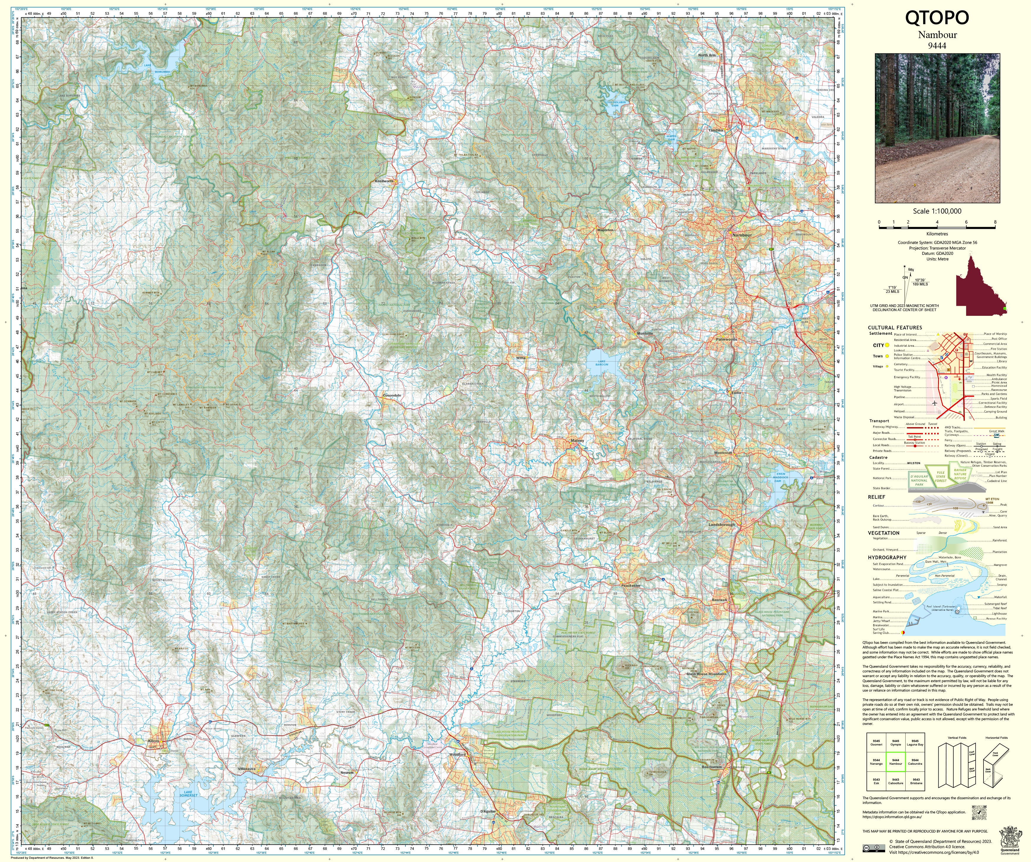 The QTopo 9444 (Nambour) sheet provides essential large-area mapping for land management, environmental assessment, urban planning, emergency operations, surveying, infrastructure design, and outdoor recreation. Produced by the Queensland Department of Resources, it presents accurate terrain modelling, hydrological networks, vegetation structure, access routes, and land-tenure boundaries across one of South East Queensland’s most varied landscapes.