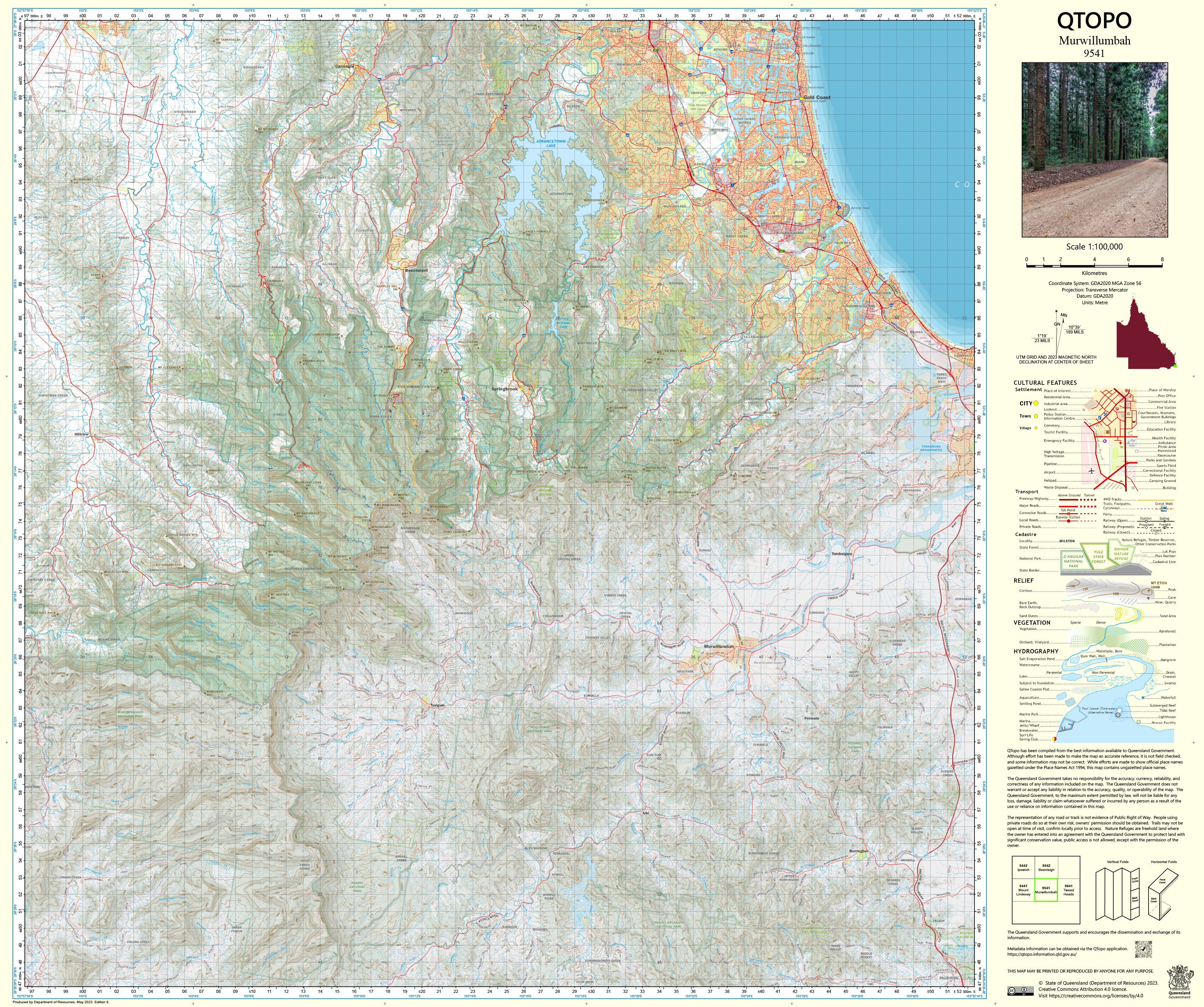 The QTopo 9541 (Murwillumbah) sheet provides authoritative, regional-scale mapping essential for land management, environmental research, emergency response, surveying, agriculture, outdoor recreation, and infrastructure planning. Produced by the Queensland Department of Resources, it delivers accurate contouring, hydrological detail, vegetation structure, and land-tenure information across a region shaped by both powerful natural forces and long-standing rural settlement.