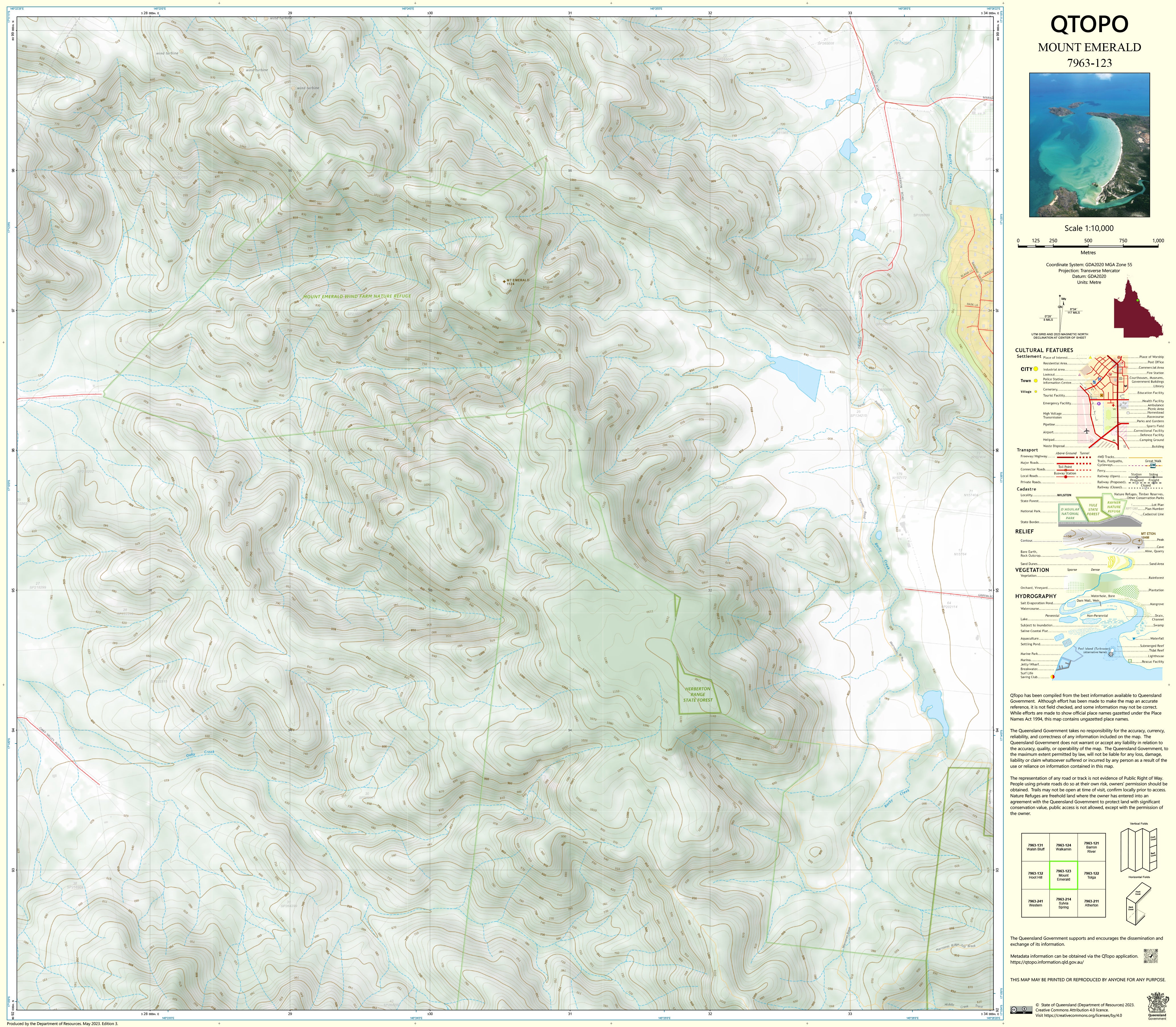 Produced by the Queensland Department of Resources, the QTopo 7963-123 — Mount Emerald sheet provides authoritative contouring, detailed cadastral boundaries, and high-resolution spatial data. Its clarity and accuracy support confident field decision-making in an area characterised by steep gradients, dissected country, and sensitive ecological zones.