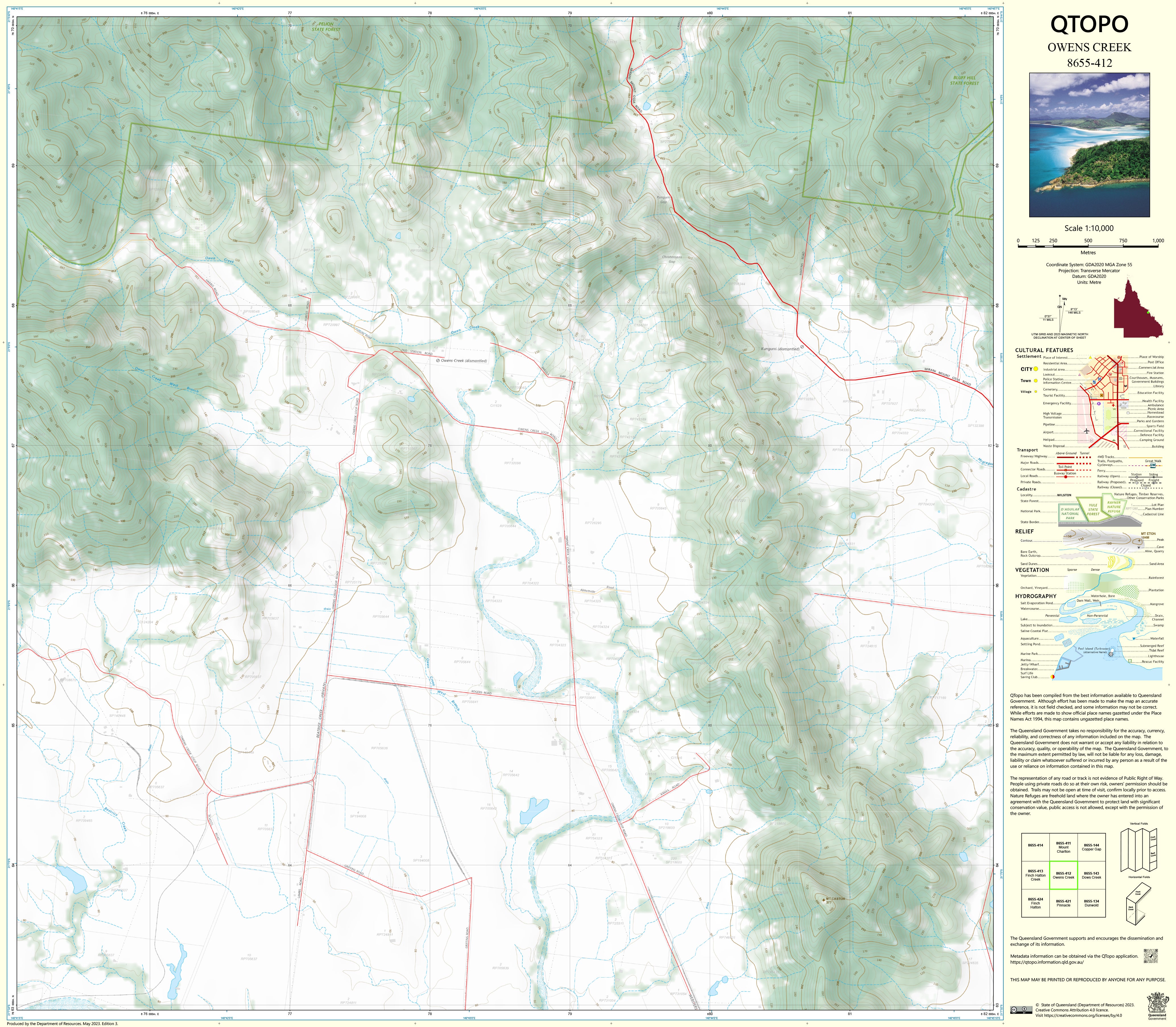 Produced by the Queensland Department of Resources, the QTopo 8655-412 — Owens Creek sheet provides authoritative contouring, hydrological data, cadastral accuracy, and high-resolution mapping. This combination of detail supports confident planning, terrain assessment, and on-ground decision-making across a mixed natural–agricultural environment.