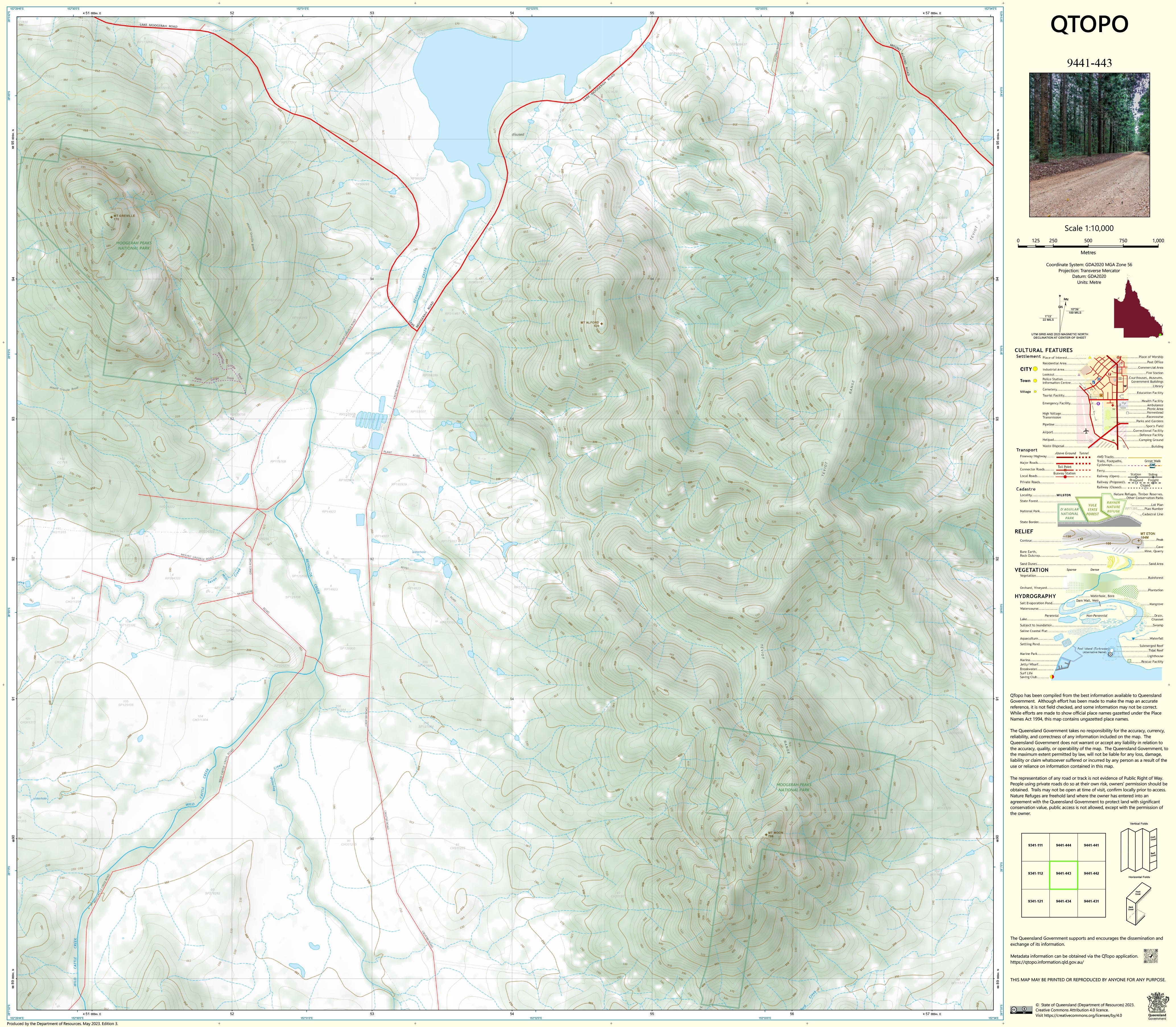 The QTopo 9441-443 sheet provides high-resolution mapping of a varied Scenic Rim landscape characterised by rolling hills, creek systems, rural holdings, and forested areas. Produced at the 1:10,000 scale, it offers exceptional spatial accuracy—ideal for surveying, engineering, ecological assessment, emergency response, and rural land management.