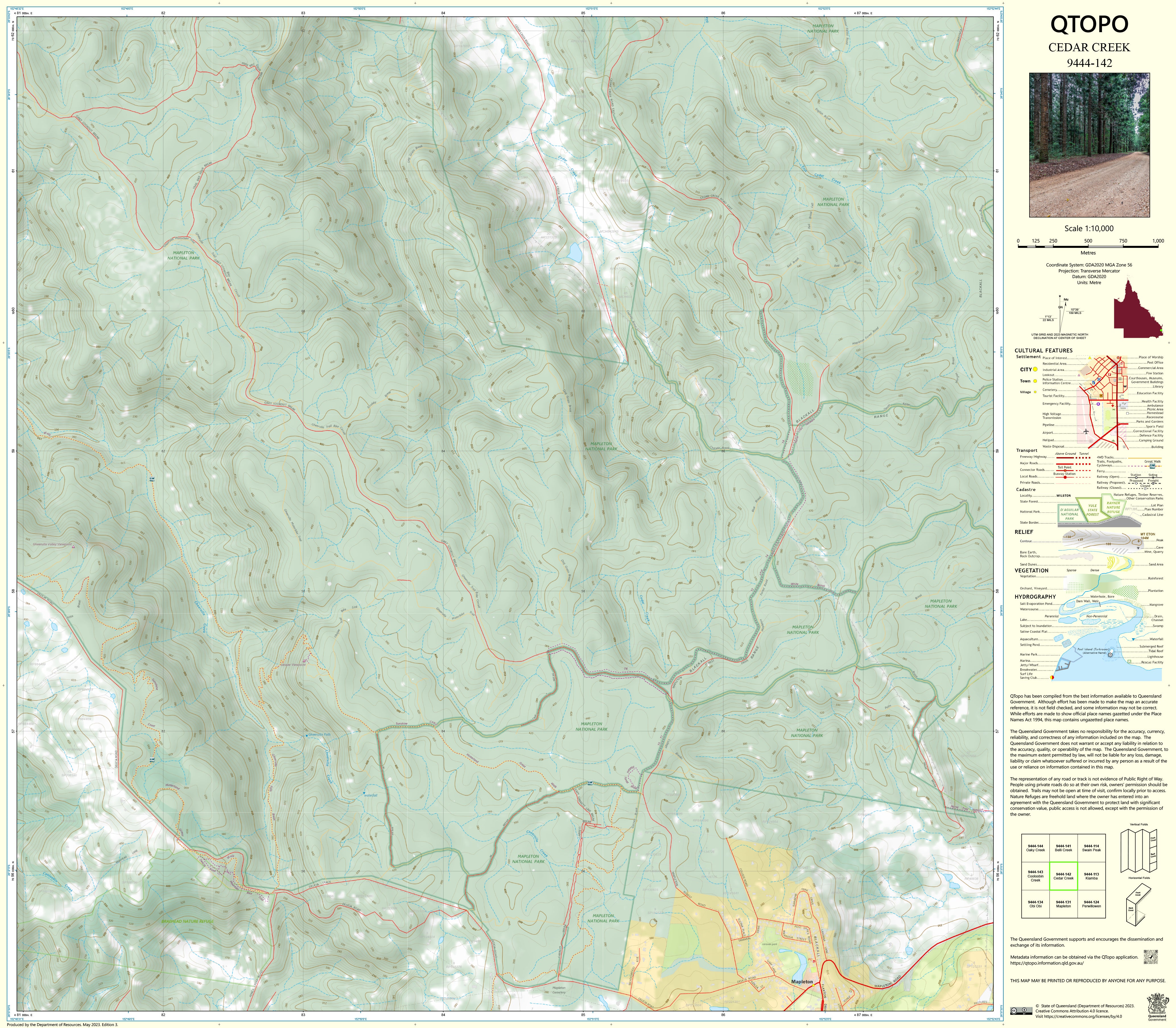 The Cedar Creek — QTopo 9444-142 — 1:10,000 Topographic Map delivers exceptional fine-scale detail across a rugged and environmentally significant landscape. With authoritative contouring, hydrology, vegetation, and cadastral information, plus multiple durable print formats, it is an essential tool for surveyors, ecologists, emergency personnel, and land managers.