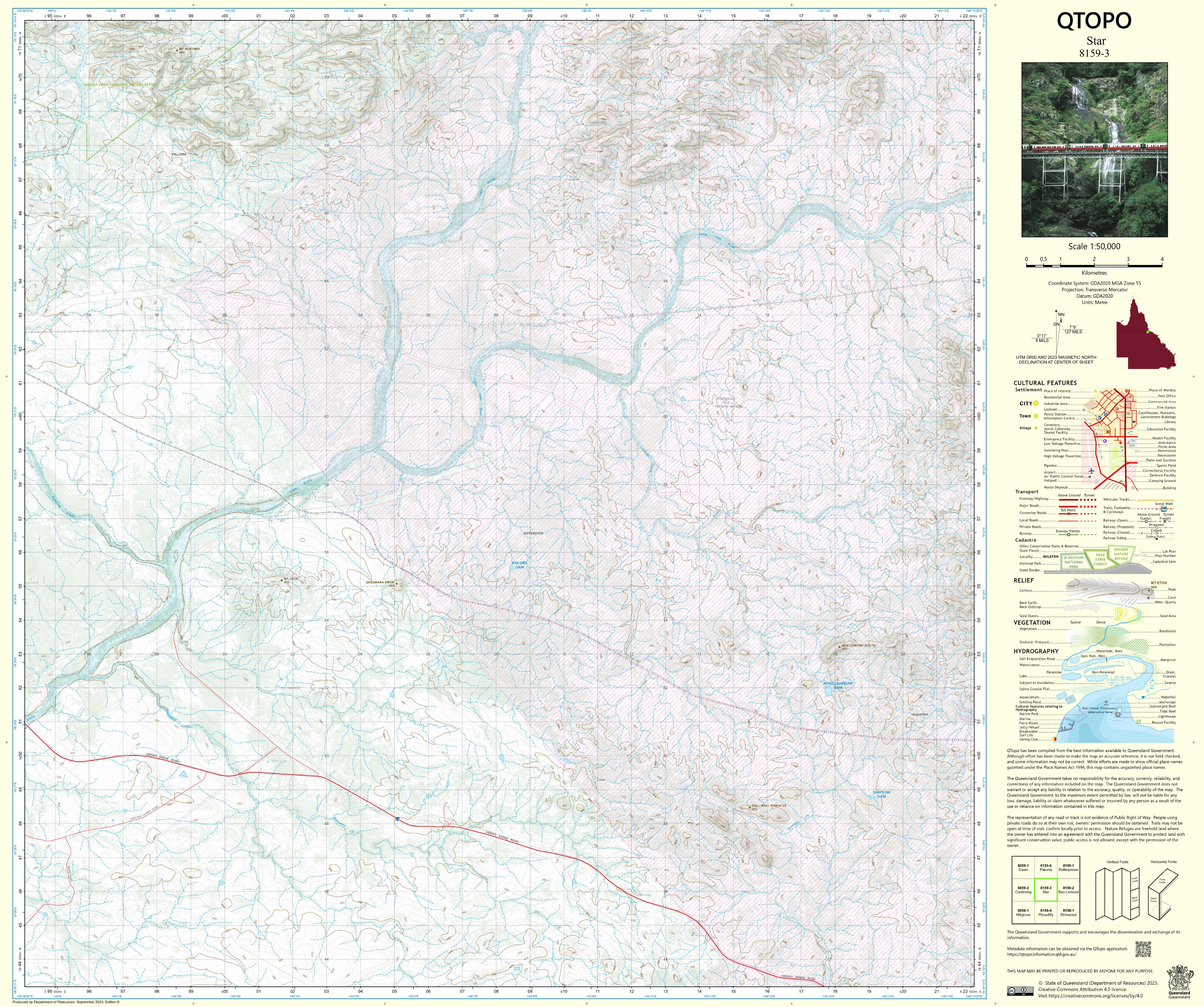 Produced by the Queensland Department of Resources, the QTopo 8159-3 (Star) map features accurate contouring, hydrology mapping, vegetation patterns, property boundaries, and infrastructure detail. Its mid-scale coverage is ideal for understanding landscape structure, watershed flow, and movement routes across large working rural environments.