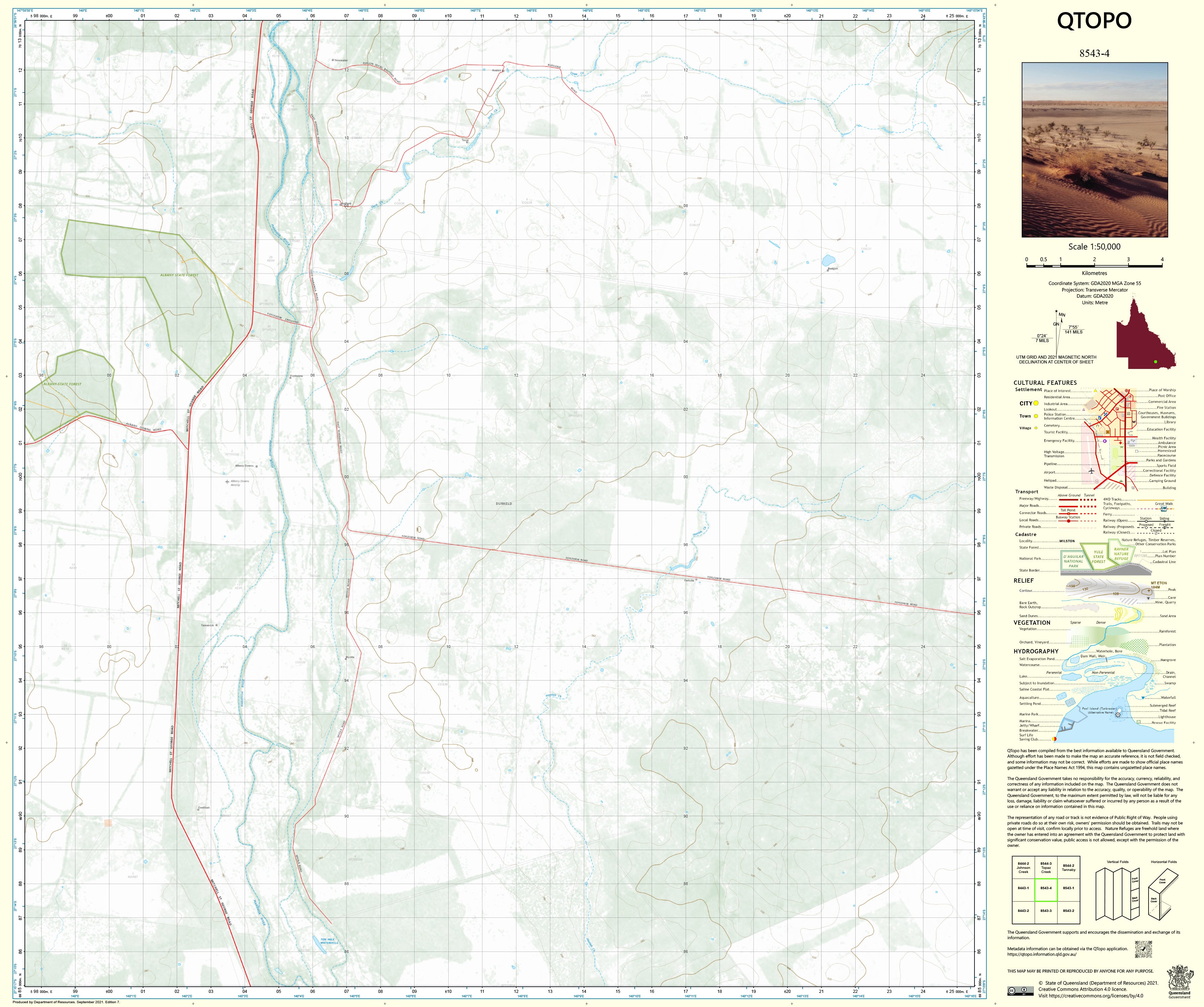 Produced by the Queensland Department of Resources, the QTopo 8543-4 map includes accurate contouring, hydrology detail, vegetation classification, access routes, and land-tenure boundaries. Its mid-scale detail is ideal for understanding large-area terrain relationships, watershed behaviour, and rural access patterns.