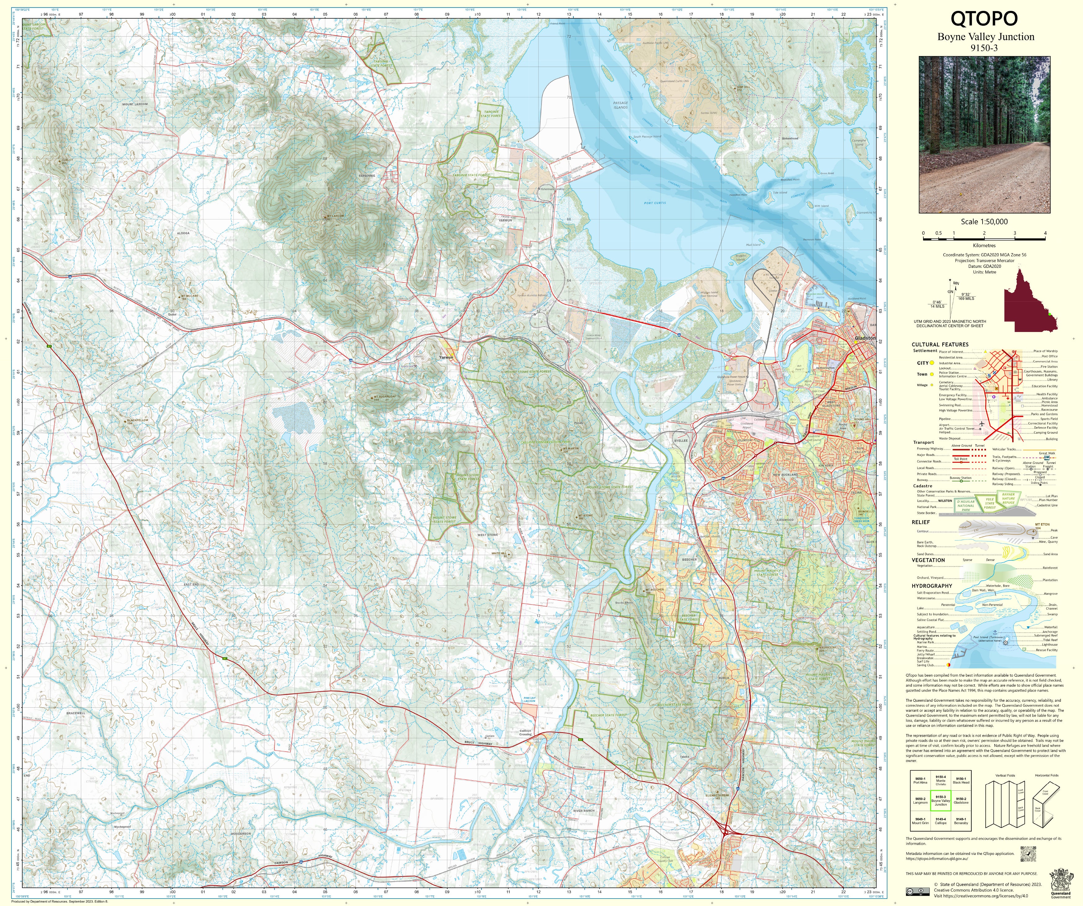 Produced by the Queensland Department of Resources, the QTopo 9150-3 (Boyne Valley Junction) map offers precise contouring, hydrological networks, vegetation patterns, road and track information, and land-tenure boundaries. Its mid-scale detail is ideal for understanding the terrain structure, watershed flow, and access routes that define this part of the Boyne Valley region.
