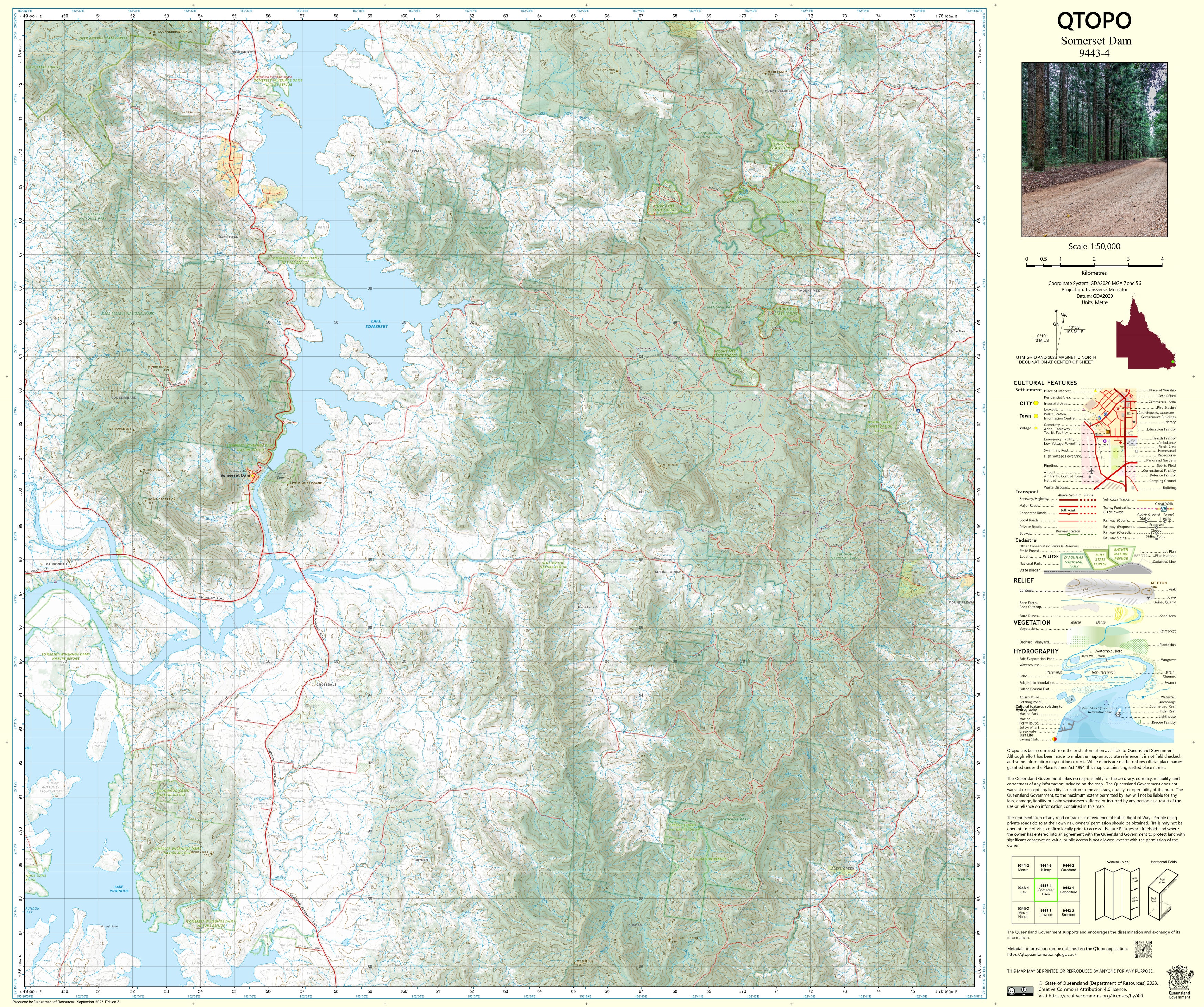 Produced by the Queensland Department of Resources, the QTopo 9443-4 (Somerset Dam) map includes accurate elevation contours, shoreline detail, hydrology networks, vegetation mapping, access routes, built infrastructure, and land-tenure boundaries. Its mid-scale resolution is ideal for understanding the complex landscape surrounding the dam, including the steep country of the Conondale and D’Aguilar Ranges.