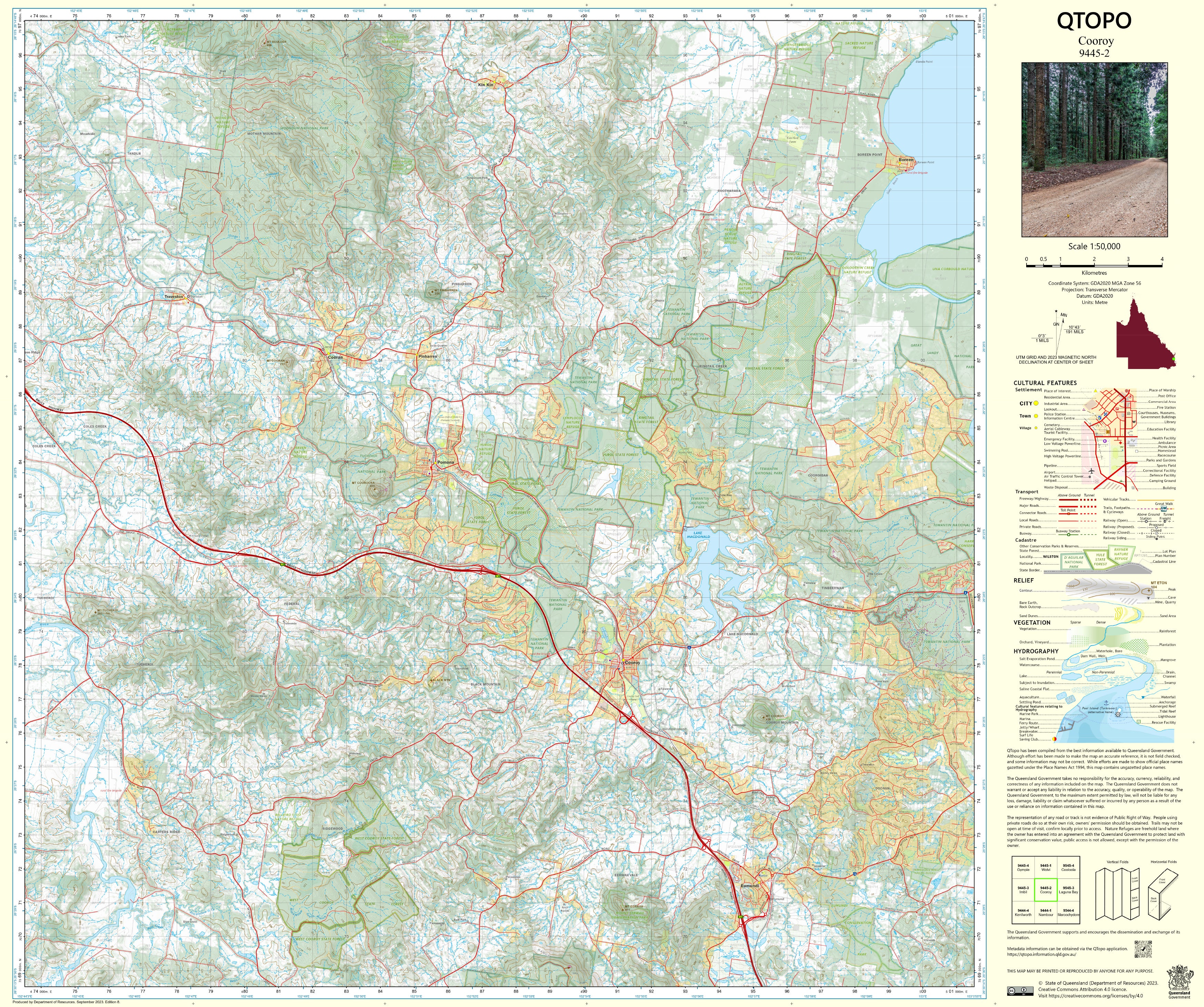 Produced by the Queensland Department of Resources, the QTopo 9445-2 (Cooroy) map includes accurate contouring, hydrology networks, vegetation mapping, access routes, built infrastructure, and land-tenure boundaries. Its mid-scale resolution captures the complexity of Cooroy’s scenic terrain, from fertile valleys to the forested foothills that surround the Noosa hinterland.