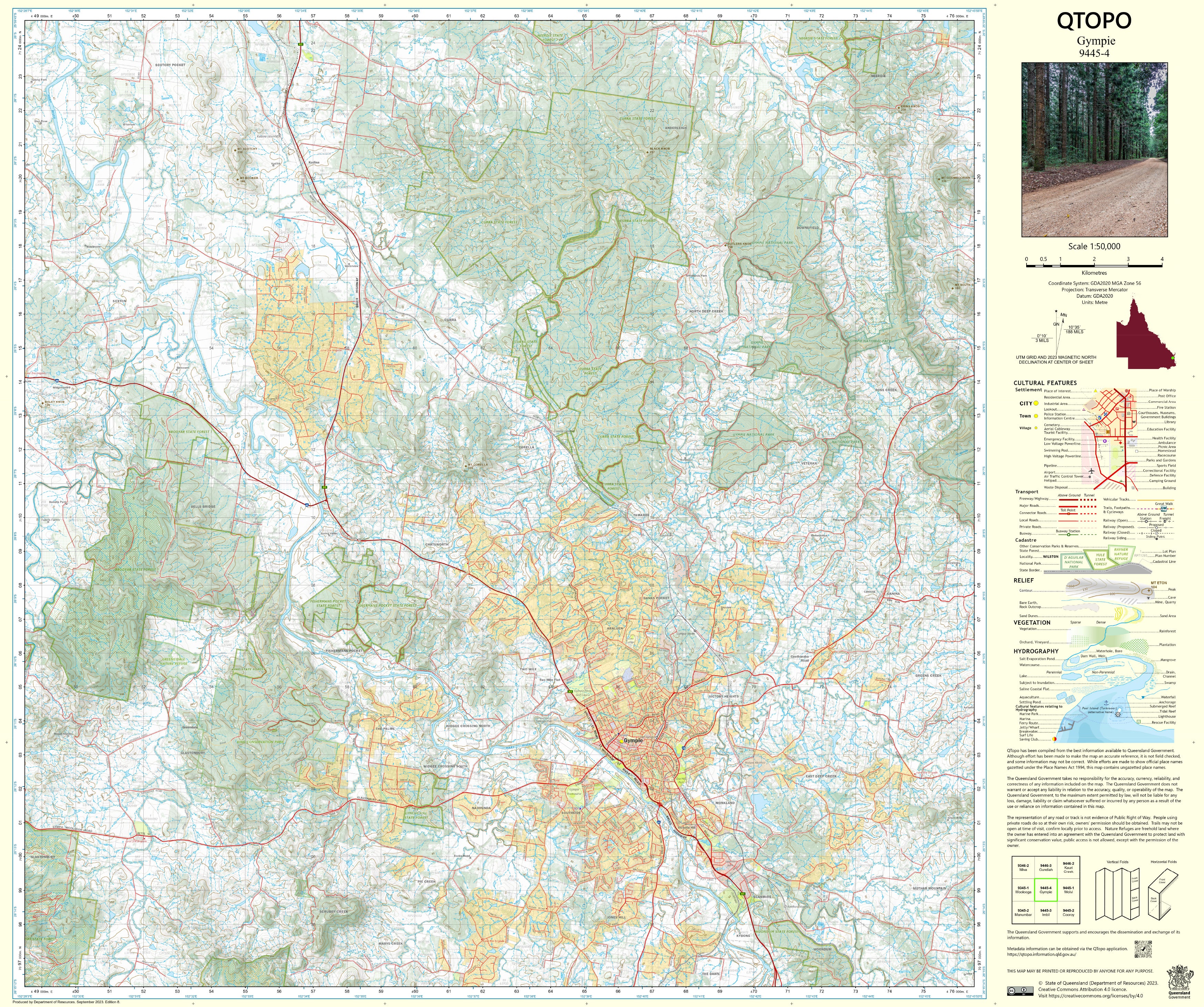Produced by the Queensland Department of Resources, the QTopo 9445-4 (Gympie) map features accurate elevation contours, hydrology networks, vegetation layers, access routes, and land-tenure boundaries. Its mid-scale clarity makes it ideal for interpreting Gympie’s varied terrain, from the Mary River floodplains to the rugged surrounding hills and state forest areas.