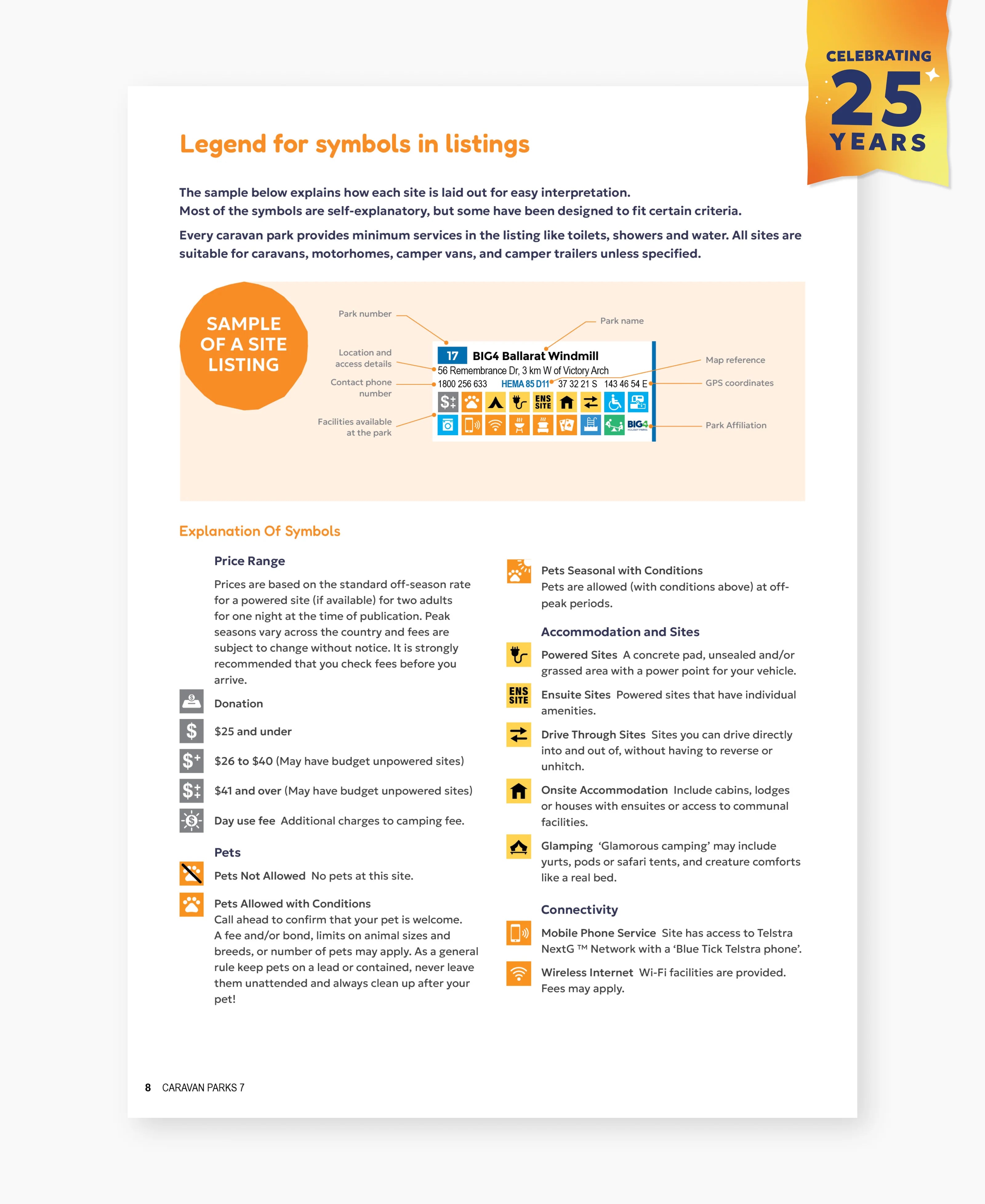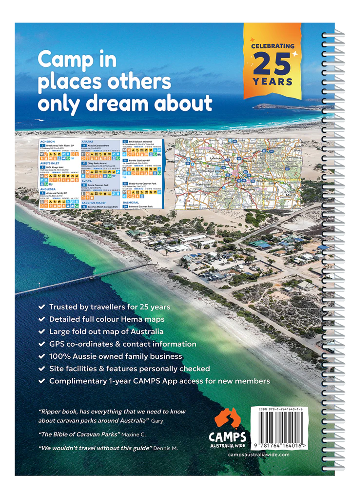 Celebrating 25 years of Aussie adventures, this spiral-bound edition is built for real travel: clear full-colour mapping, intuitive symbols, and practical detail that lets you compare facilities, access, and price ranges at a glance — whether you’re planning the Big Lap or pulling in late for an overnight stop.