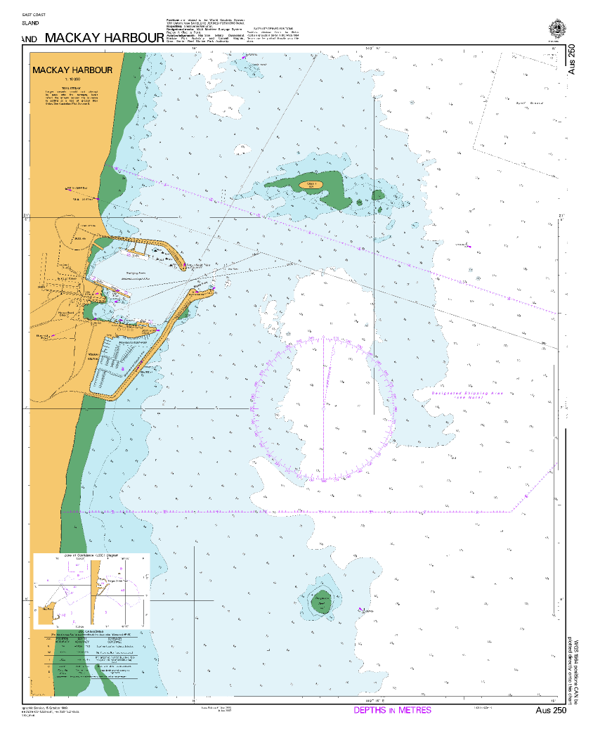 Get harbour-scale clarity where it counts. AUS 250 is a dedicated plans sheet featuring two detailed insets—Hay Point (1:15,000) and Mackay Harbour (1:10,000)—both on UTM projection for clean GPS plotting. Ideal for berth approaches, buoyed fairways, swing basins, and terminal operations.