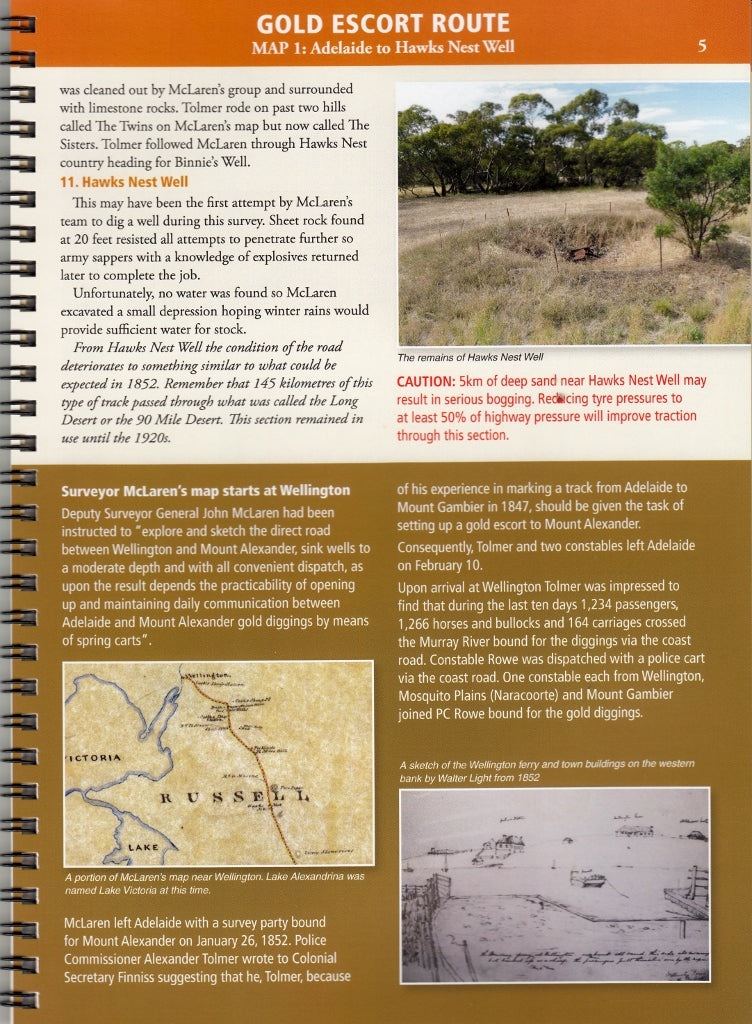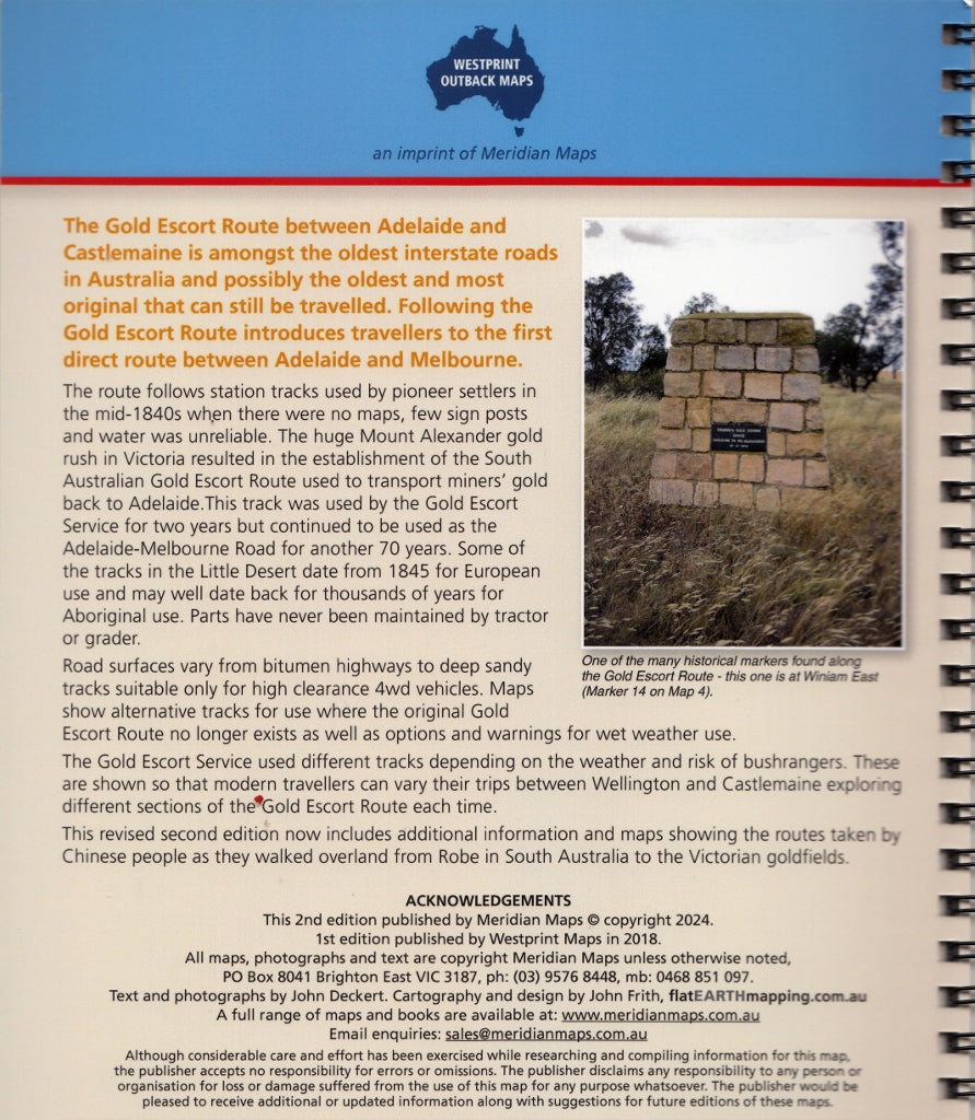 Road surfaces vary from bitumen highways to deep sandy tracks suitable only for high clearance 4wd vehicles. Maps show alternative tracks for use where the original Gold Escort Route no longer exists as well as options and warnings for wet weather use.