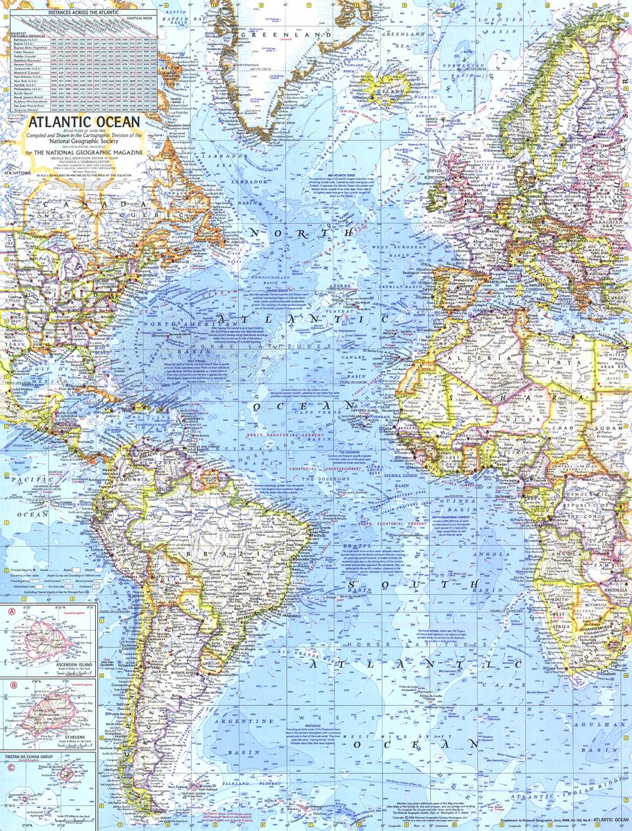 A definitive late-1960s portrait of the Atlantic Ocean, rendered with clarity and depth. Published in June 1968 by National Geographic to accompany the celebrated Atlantic Ocean Floor sheet, this map layers ocean bathymetry, currents and winds, physical features, and a wealth of historical notes into a cohesive, legible whole. It’s a scientific snapshot of the Atlantic in the age of modern oceanography—made to study, admire, and display.