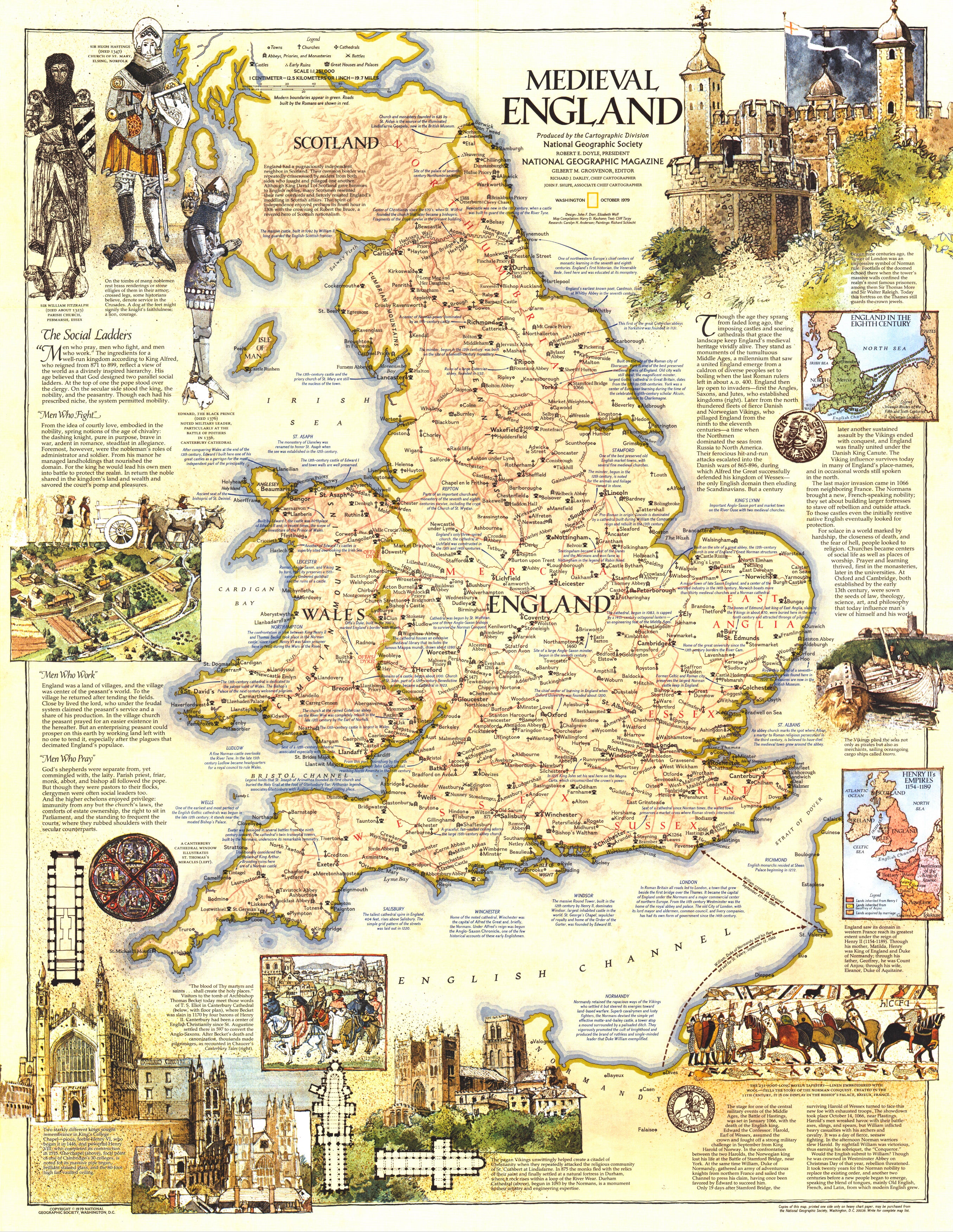Take a captivating journey into the heart of medieval England with this richly illustrated historical map by National Geographic, originally published in October 1979. This exquisite wall map brings to life the castles, towns, battles, trade routes, and political boundaries that shaped England during one of its most fascinating and transformative eras.