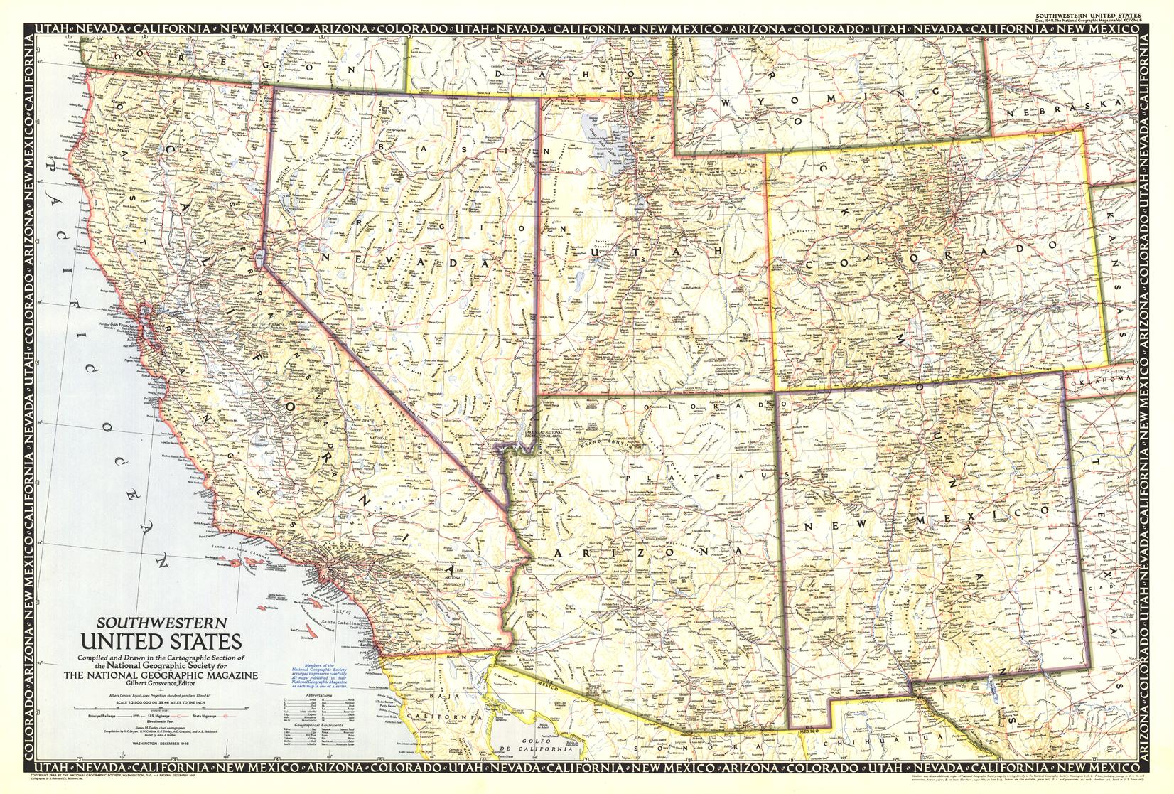 A snapshot of the postwar Southwest, rendered with clarity and restraint. Published by National Geographic in December 1948, this regional sheet captures the Colorado Plateau, canyon country, deserts and ranges before the big waterworks era—most notably no Lake Powell and no Glen Canyon Dam (construction wouldn’t begin until 1956). Clean, legible cartography rewards both room-distance viewing and close study—made to admire, reference, and display.