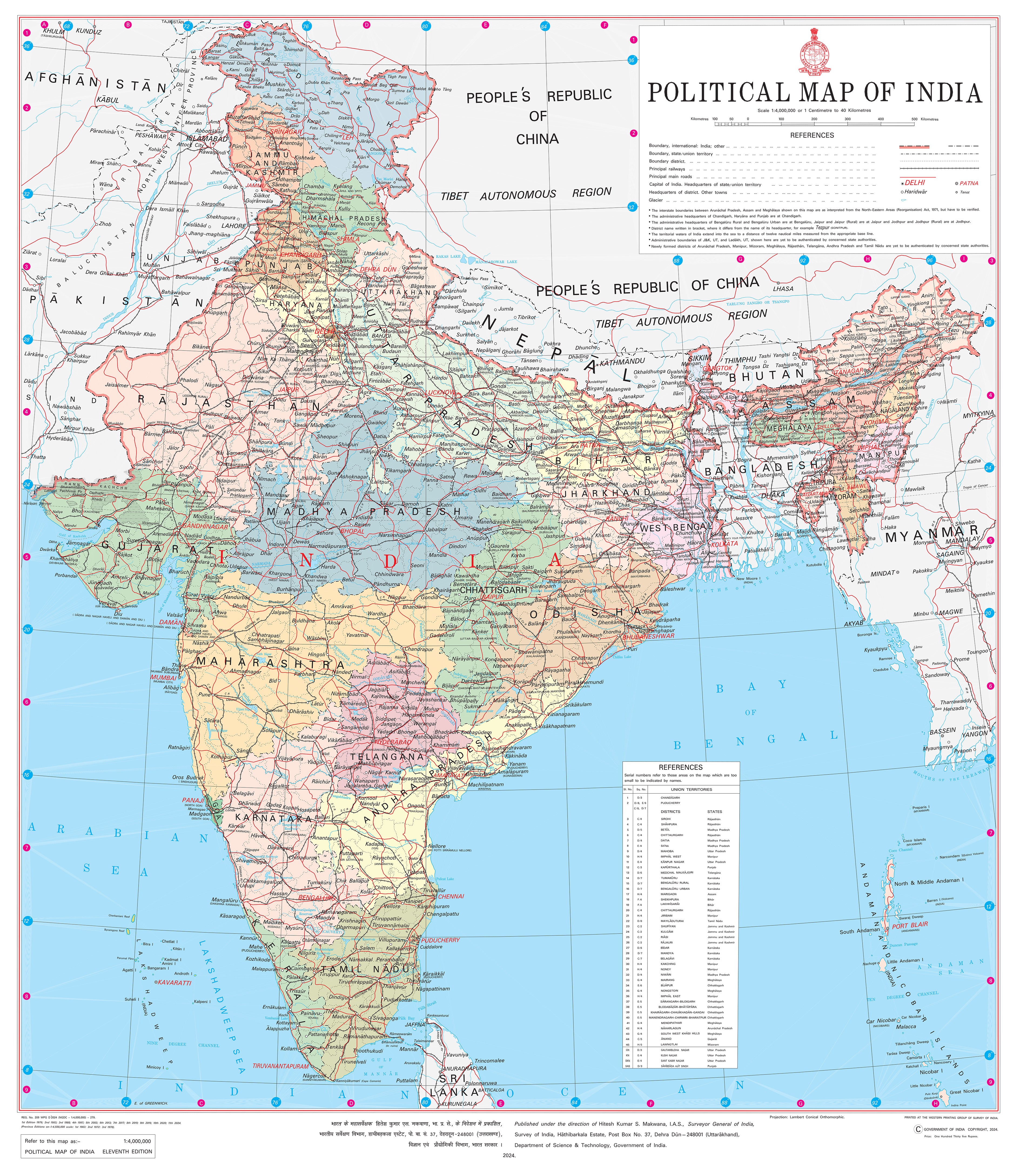 This detailed political map of India, created by the Survey of India National Mapping Agency, offers a clear view of the country's political landscape. Featuring national and state boundaries, the states are colour-coded for easy identification, along with key cities, railways, and major roads. Whether for educational use, home decor, or office spaces, this map is a great tool for understanding India's geography and political divisions.