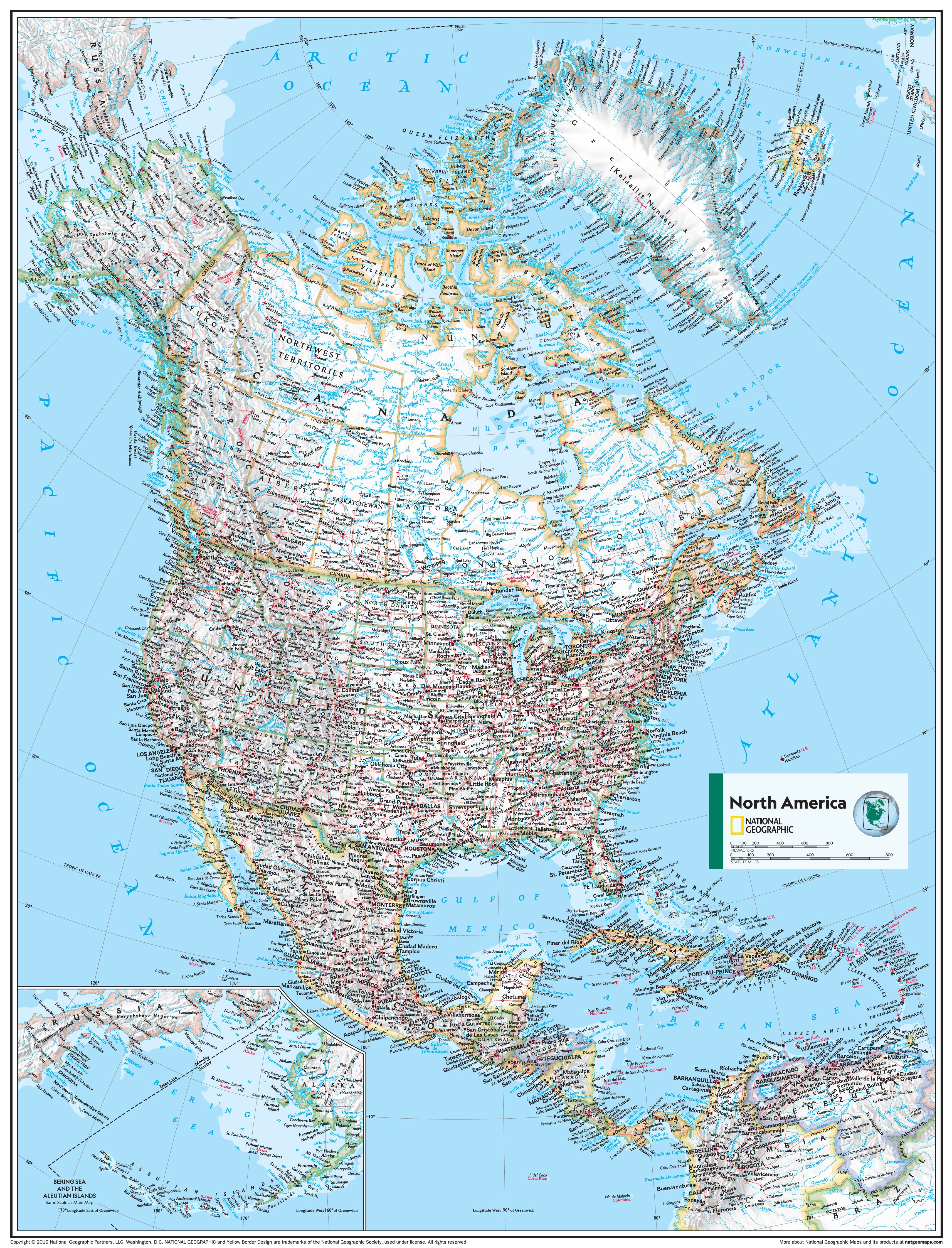 This map clearly delineates international borders, national capitals, state and provincial boundaries, and major cities, while also including physical relief to provide a subtle sense of the continent’s varied landscapes. Every detail—from the Arctic reaches of Greenland to the tropical coasts of the Caribbean—is presented with National Geographic’s signature cartographic precision.