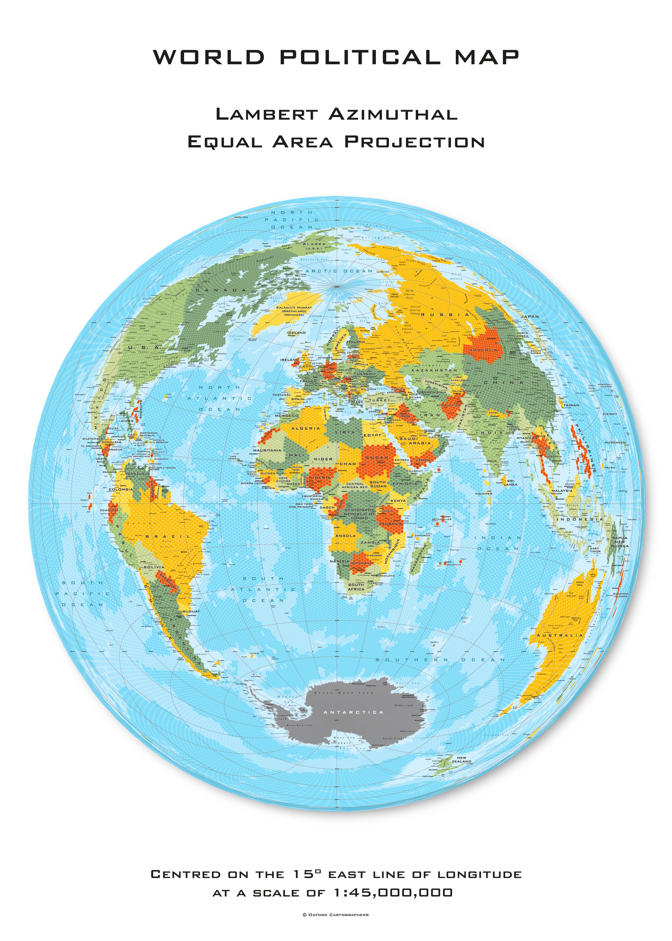 Centred on 15° East Longitude: Offers a view that rebalances the world away from the familiar Atlantic- or Pacific-centred projections.