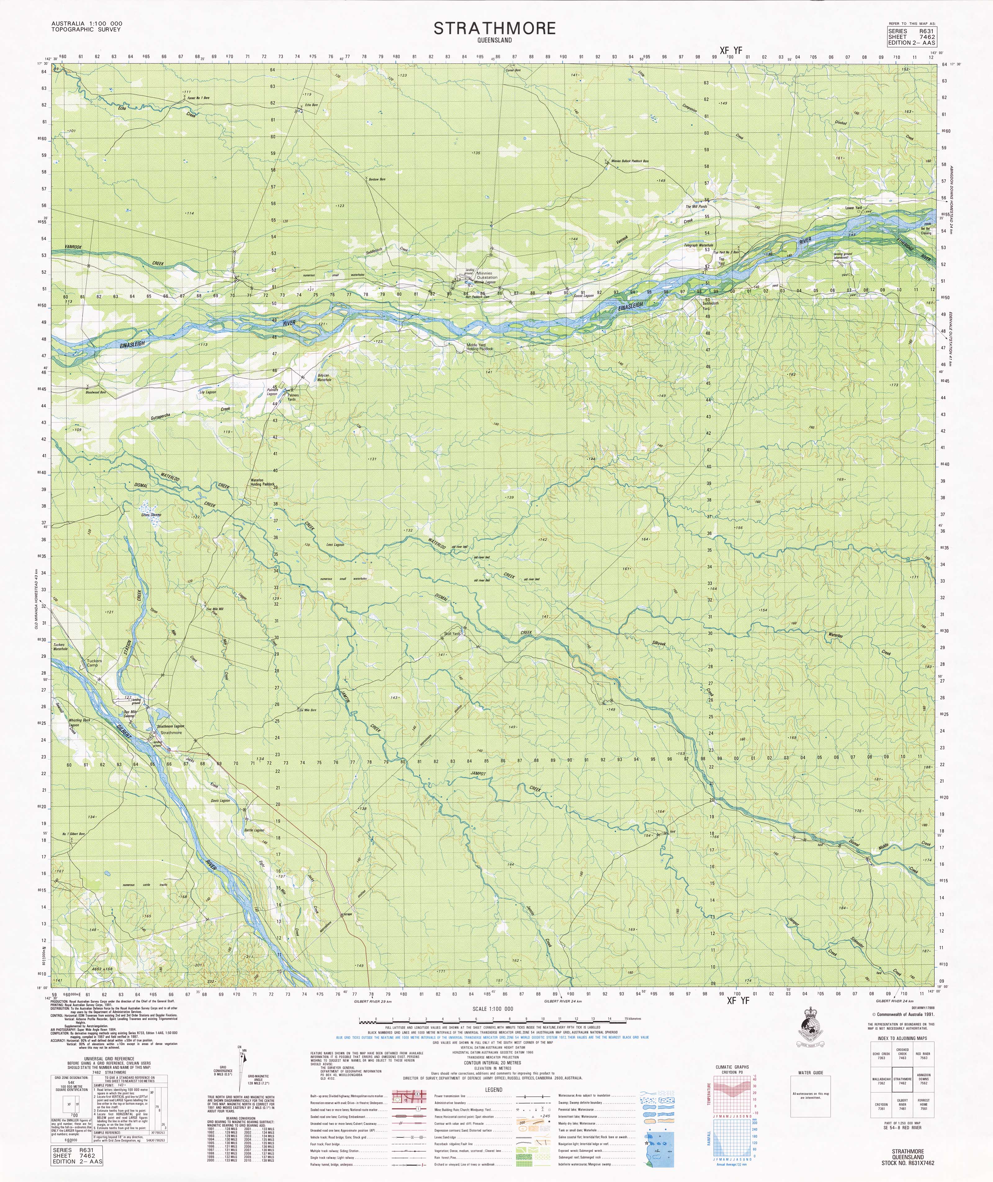 At a scale of 1:100,000, 1cm on the map represents 1km on the ground. Each map covers a minimum area of 0.5 degrees longitude by 0.5 degrees latitude or about 54 kilometres by 54 kilometres. The contour interval is 20 metres. Many maps are supplemented by hill shading.