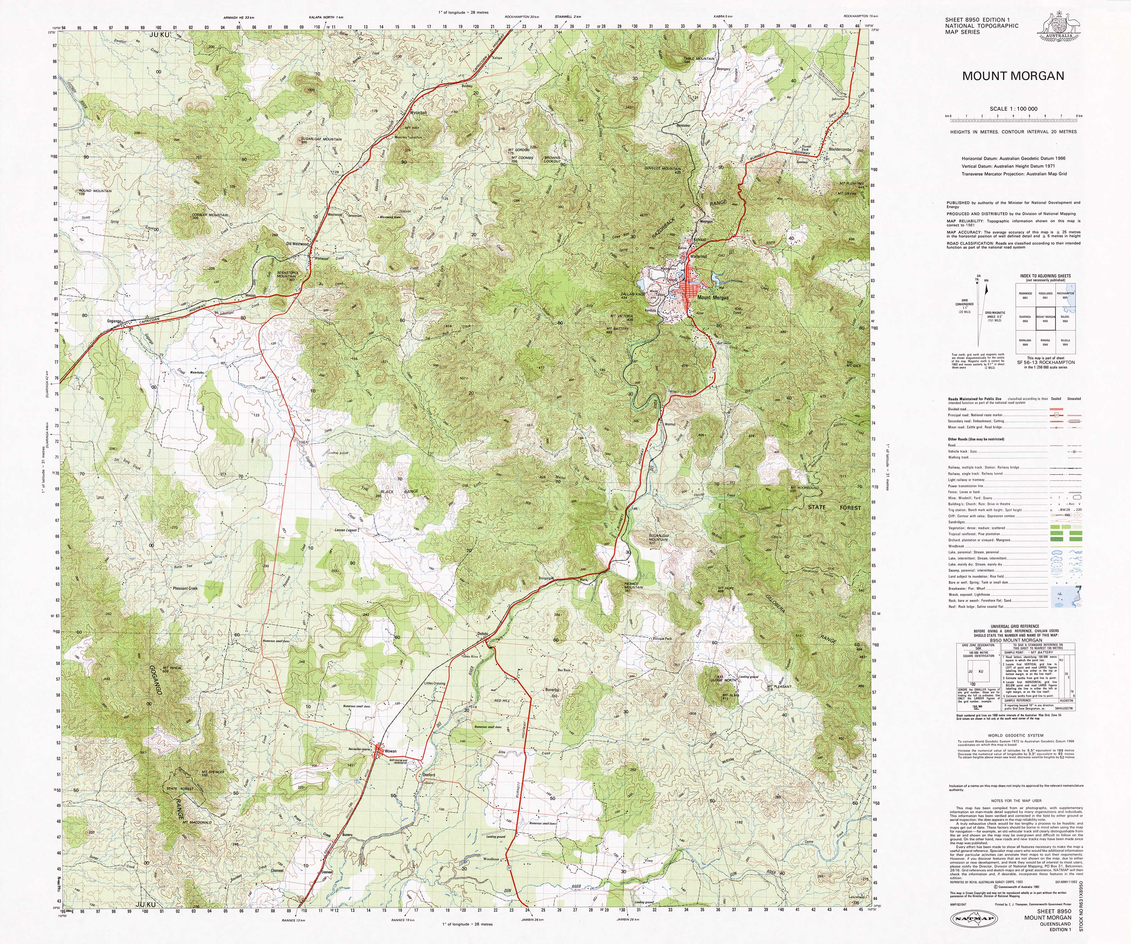 At a scale of 1:100,000, 1cm on the map represents 1km on the ground. Each map covers a minimum area of 0.5 degrees longitude by 0.5 degrees latitude or about 54 kilometres by 54 kilometres. The contour interval is 20 metres. Many maps are supplemented by hill shading.