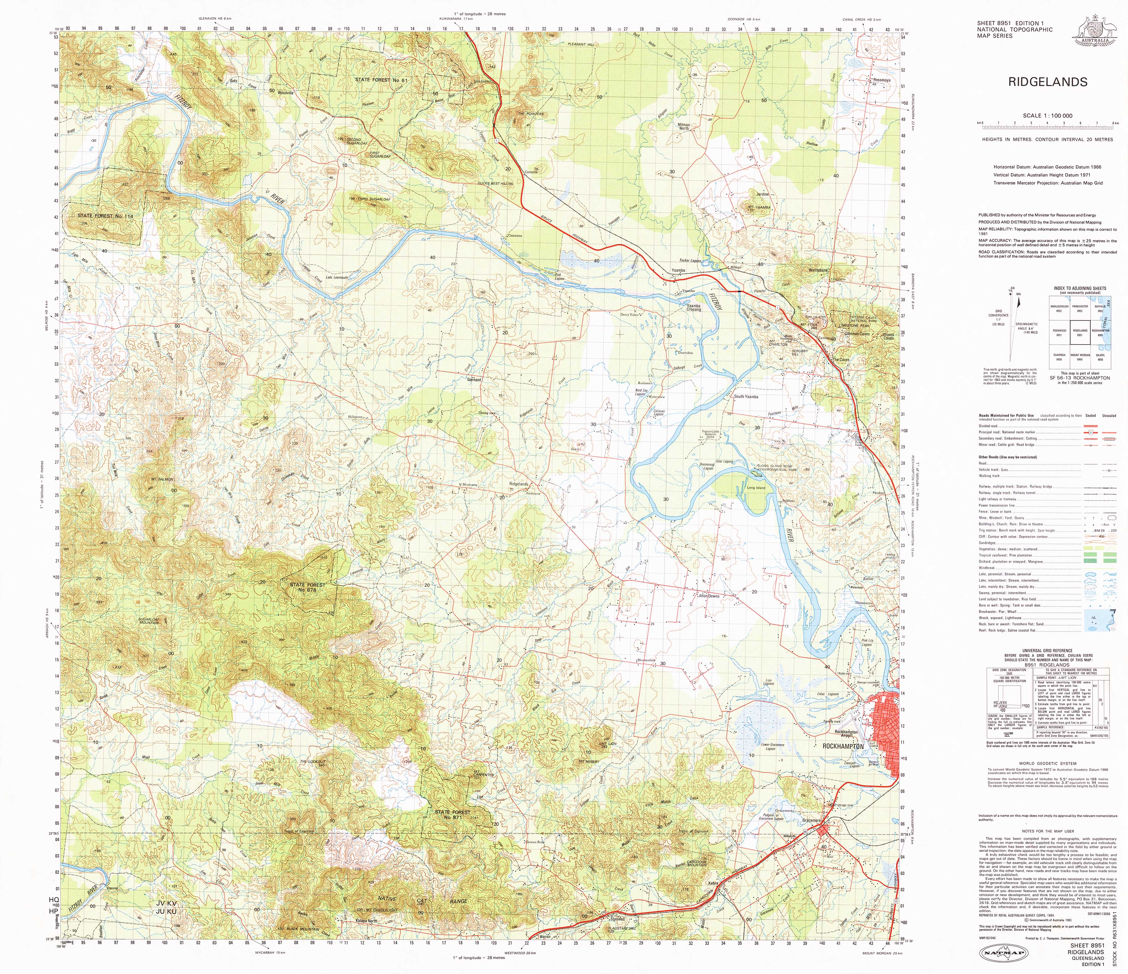 At a scale of 1:100,000, 1cm on the map represents 1km on the ground. Each map covers a minimum area of 0.5 degrees longitude by 0.5 degrees latitude or about 54 kilometres by 54 kilometres. The contour interval is 20 metres. Many maps are supplemented by hill shading.