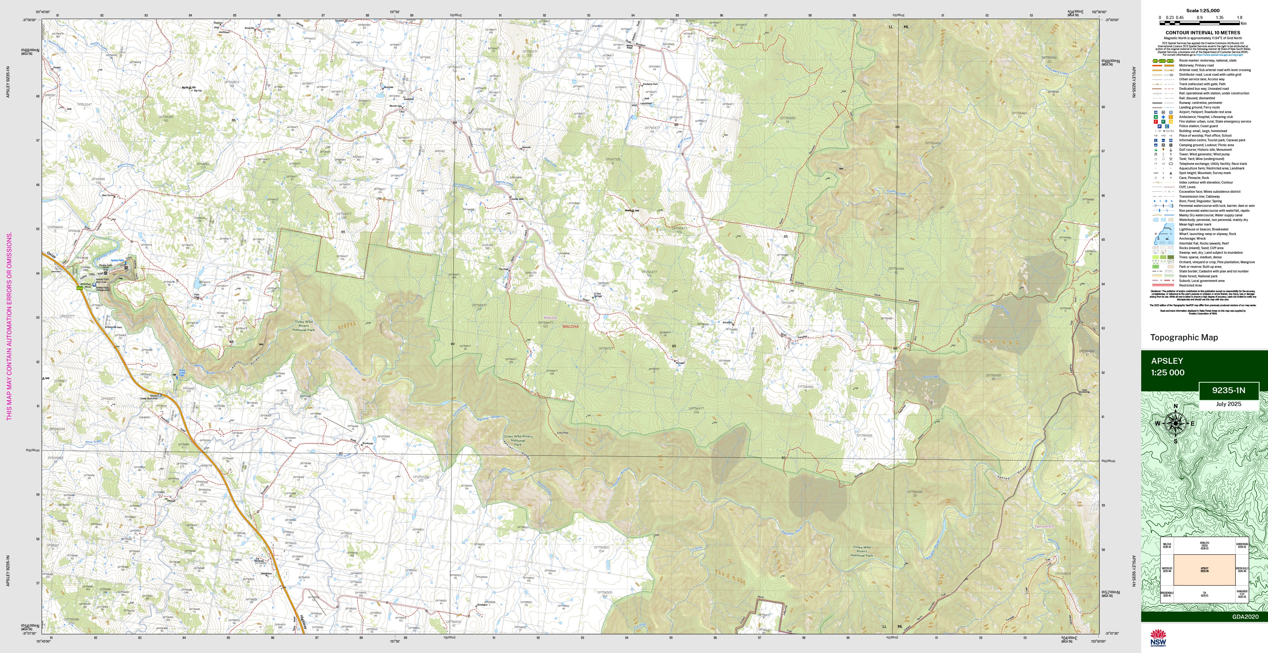 The Apsley topographic map by LPI shows contours, streams, roads, tracks, buildings, place names, points of interest, vegetation, selected administrative boundaries and much more.