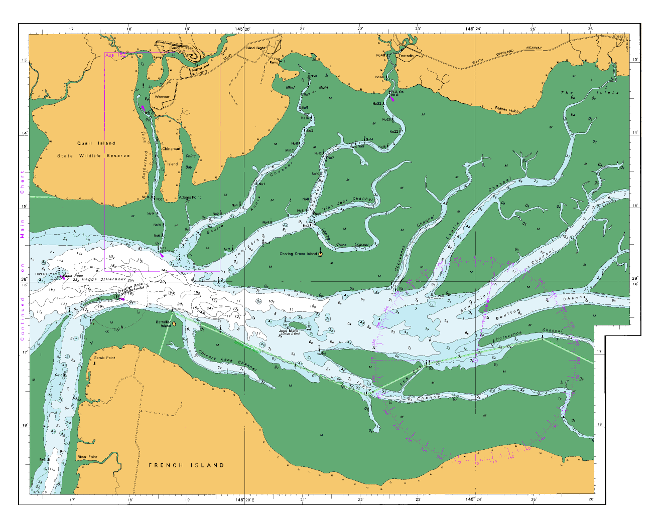 Plan and brief with confidence using AUS 151. Focused bay-entry coverage at 1:37,500 on Universal Transverse Mercator (UTM) — ideal for approach shaping, fixing, and waypoint checks across the Entrance, North Arm, and key channels. Includes a matching-scale continuation eastward for the upper reaches.
